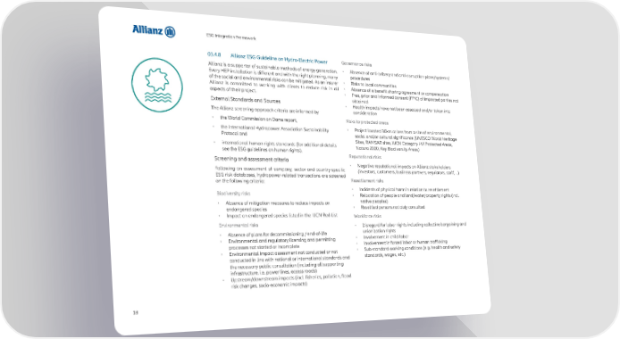 ESG Integration Framework 03.4.8 Allianz ESG Guideline on Hydro-Electric Power Governance risks Allianz is a supporter of sustainable methods of energy generation. • Absence of anti-bribery and anti-corruption plans/systems/ Every HEP installation is different and with the right planning, many procedures of the social and environmental risks can be mitigated. As an insurer • Risks to local communities Allianz is committed to working with clients to reduce risk in all • Absence of a benefit sharing agreement or compensation aspects of their project. • Free, prior and informed consent (FPIC) of impacted parties not External Standards and Sources obtained • Health impacts have not been assessed and/or taken into The Allianz screening approach criteria are informed by consideration • the World Commission on Dams report, Risks to protected areas • the International Hydropower Association Sustainability • Project located 30km or less from a site of environmental, Protocol and social and/or cultural significance (UNESCO World Heritage • international human rights standards (for additional details Sites, RAMSAR sites, IUCN Category I-VI Protected Areas, see the ESG guidelines on human rights). Natura 2000, Key Biodiversity Areas) Screening and assessment criteria Reputational risks • Negative reputational impacts on Allianz stakeholders Following an assessment of company, sector and country-specific (investors, customers, business partners, regulators, staff, ...) ESG risk databases, hydropower-related transactions are screened Resettlement risks on the following criteria: • Incidents of physical harm in relation to resettlement Biodiversity risks • Relocation of people and land/water/property rights (incl. • Absence of mitigation measures to reduce impacts on native peoples) endangered species • Resettled persons not duly consulted • Impact on endangered species listed in the IUCN Red List Workforce risks Environmental risks • Disregard for labor rights including collective bargaining and • Absence of plans for decommissioning / end-of-life unionization rights • Environmental and regulatory licensing and permitting • Involvement in child labor processes not started or incomplete • Involvement in forced labor or human trafficking • Environmental impact assessment not conducted or not • Sub-standard working conditions (e.g. health and safety conducted in line with national or international standards and standards, wages, etc.) the necessary public consultation (including all supporting infrastructure, i.e. power lines, access roads) • Upstream/downstream impacts (incl. fisheries, pollution, flood risk changes, socio-economic impacts) 18