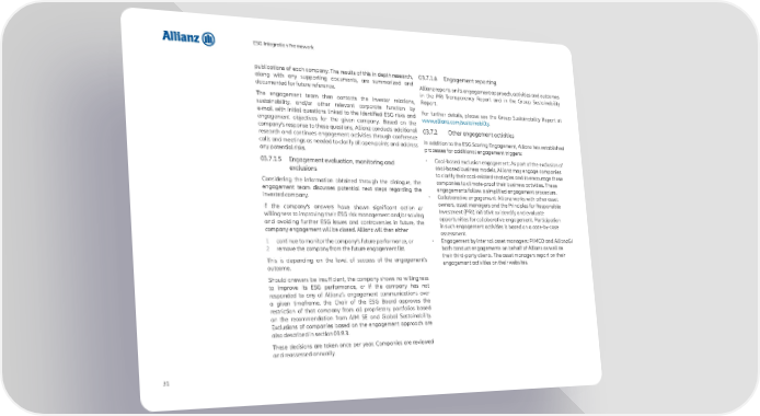 ESG Integration Framework publications of each company. The results of this in depth research, 03.7.1.6 Engagement reporting along with any supporting documents, are summarized and Allianz reports on its engagement approach, activities and outcomes documented for future reference. in the PRI Transparency Report and in the Group Sustainability The engagement team then contacts the investor relations, Report. sustainability, and/or other relevant corporate function by For further details, please see the Group Sustainability Report at e-mail with initial questions linked to the identified ESG risks and www.allianz.com/sustainability. engagement objectives for the given company. Based on the company’s response to these questions, Allianz conducts additional 03.7.2 Other engagement activities research and continues engagement activities through conference In addition to the ESG Scoring Engagement, Allianz has established calls and meetings as needed to clarify all open points and address processes for additional engagement triggers: any potential risks. 03.7.1.5 Engagement evaluation, monitoring and • Coal-based exclusion engagement: As part of the exclusion of exclusions coal-based business models, Allianz may engage companies to clarify their coal-related strategies and to encourage these Considering the information obtained through the dialogue, the companies to climate-proof their business activities. These engagement team discusses potential next steps regarding the engagements follow a simplified engagement procedure. invested company. • Collaborative engagement: Allianz works with other asset If the company’s answers have shown significant action or owners, asset managers and the Principles for Responsible willingness to improving their ESG risk management and/or solving Investment (PRI) initiative to identify and evaluate and avoiding further ESG issues and controversies in future, the opportunities for collaborative engagement. Participation company engagement will be closed. Allianz will then either in such engagement activities is based on a case-by-case assessment. 1 continue to monitor the company’s future performance, or • Engagement by internal asset managers: PIMCO and AllianzGI 2 remove the company from the future engagement list. both conduct engagements on behalf of Allianz as well as This is depending on the level of success of the engagement’s their third-party clients. The asset managers report on their outcome. engagement activities on their websites. Should answers be insufficient, the company shows no willingness to improve its ESG performance, or if the company has not responded to any of Allianz’s engagement communications over a given timeframe, the Chair of the ESG Board approves the restriction of that company from all proprietary portfolios based on the recommendation from AIM SE and Global Sustainability. Exclusions of companies based on the engagement approach are also described in section 03.9.3. These decisions are taken once per year. Companies are reviewed and reassessed annually. 31