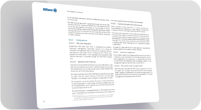 ESG Integration Framework for an overview). See section 03.6.2 for a detailed overview of the information system and communicated to asset managers. scoring process. 03.6.2.3 Operationalizing the ESG scoring process The ESG Scoring Approach is governed through the Allianz ESG When analyzing current investments in a given portfolio and Functional Rule for Investments (EFRI). The initial implementation when selecting new investments, an asset manager must take the of the Scoring Approach was piloted on the portfolios of Allianz investment’s ESG score and applicable threshold into account. Life Germany (Allianz Lebensversicherungs-AG) and Allianz Health Germany (Allianz Private Krankenversicherungs-AG) and by the end This means that investments in issuers below the threshold are to 1 of 2017 the process was rolled out to all in-scope Allianz proprietary be avoided. This applies to existing investments, reinvestments and portfolios globally. new investments. Should an asset manager hold investments below the threshold, a comply-or-explain clause becomes effective. Asset 03.6.2 Scoring process managers must justify these investments and properly document in biannual ESG review meetings with AIM supported by Global 03.6.2.1 ESG data integration Sustainability. Quantitative ESG data from MSCI is integrated into Allianz’s Examples for valid justifications include regulatory requirements, investment management information systems. From there, all market availability or proprietary research findings. investment management staff, as well as the respective portfolio 03.6.2.4 Systematic engagement management and analyst teams at AllianzGI and PIMCO have access to the MSCI data. Further qualitative and quantitative ESG Further, Allianz subjects issuers below the threshold in its portfolio to research and data is accessible through the MSCI ESG Manager a systematic, goal-oriented and time-limited engagement process. tool. Such engagements are conducted on a case-by-case basis either 03.6.2.2 Setting the ESG threshold by AIM and/or the respective asset manager(s). Details on the engagement approach are described in section 03.7.1. Companies with a low ESG performance are generally linked to high 03.6.2.5 ESG-specific asset manager reviews ESG and reputational risks. In order to identify companies with a low ESG performance, the scoring process uses an ESG threshold. The ESG integration (including the ESG scoring approach) is part of threshold is set in the following way: the regular asset manager review and ESG-specific asset manager 2 review meetings. Implementation of the scoring requirements is a All corporate issuers in the MSCI ESG Rating universe are grouped measured KPI, relevant to the financial compensation of the asset by region (Europe, North America, Asia-Pacific and Emerging management firms (see also section 03.10.2). Markets). For sovereign issuers no regional categorization is done. The threshold is set at the bottom 10 percent in ESG performance for each issuer group. In other words, the 10th percentile score is set as the threshold for a given regional group. Allianz flags all issuers below the respective threshold. The ESG threshold is reassessed based on ESG data every three years. Thresholds are incorporated into the investment management 1 For example, assets owned by Allianz Austria are excluded from the Group ESG Scoring Approach, as this OE has developed their own ESG scoring approach. 29 2 All issuers rated by MSCI ESG Research.