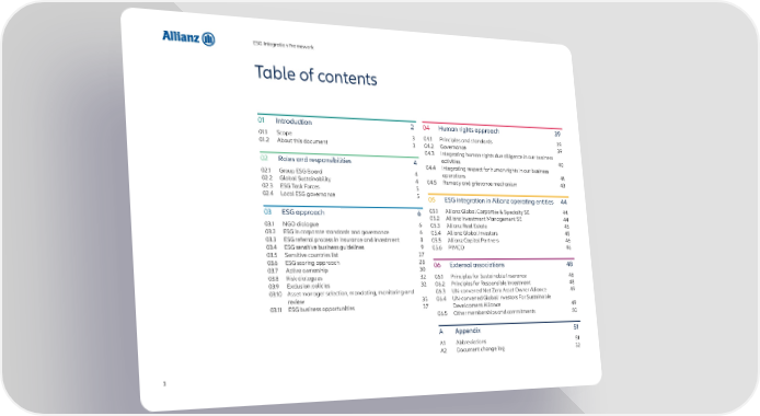 ESG Integration Framework Table of contents 01 Introduction 2 04 Human rights approach 39 01.1 Scope 3 04.1 Principles and standards 39 01.2 About this document 3 04.2 Governance 39 04.3 Integrating human rights due diligence in our business 02 Roles and responsibilities 4 activities 40 04.4 Integrating respect for human rights in our business 02.1 Group ESG Board 4 operations 41 02.2 Global Sustainability 4 04.5 Remedy and grievance mechanism 43 02.3 ESG Task Forces 5 02.4 Local ESG governance 5 05 ESG integration in Allianz operating entities 44 03 ESG approach 6 05.1 Allianz Global Corporate & Specialty SE 44 05.2 Allianz Investment Management SE 44 03.1 NGO dialogue 6 05.3 Allianz Real Estate 45 03.2 ESG in corporate standards and governance 6 05.4 Allianz Global Investors 45 03.3 ESG referral process in insurance and investment 8 05.5 Allianz Capital Partners 46 03.4 ESG sensitive business guidelines 9 05.6 PIMCO 46 03.5 Sensitive countries list 27 03.6 ESG scoring approach 28 06 External associations 48 03.7 Active ownership 30 03.8 Risk dialogues 32 06.1 Principles for Sustainable Insurance 48 03.9 Exclusion policies 32 06.2 Principles for Responsible Investment 48 03.10 Asset manager selection, mandating, monitoring and 06.3 UN-convened Net Zero Asset Owner Alliance 49 review 35 06.4 UN-convened Global Investors For Sustainable 03.11 ESG business opportunities 37 Development Alliance 49 06.5 Other memberships and commitments 50 A Appendix 51 A1 Abbreviations 51 A2 Document change log 52 1