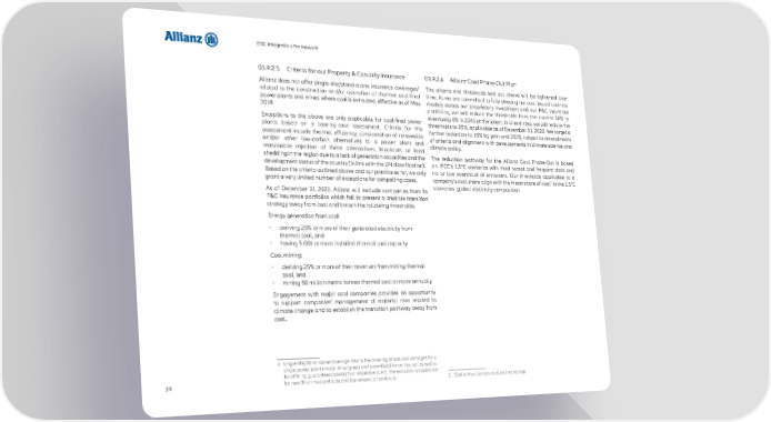 ESG Integration Framework 03.9.2.5 Criteria for our Property & Casualty insurance 03.9.2.6 Allianz Coal Phase-Out Plan 1 Allianz does not offer single-site/stand-alone insurance coverages The criteria and thresholds laid out above will be tightened over related to the construction and/or operation of thermal coal-fired time. As we are committed to fully phasing out coal-based business power plants and mines where coal is extracted, effective as of May models across our proprietary investment and our P&C insurance 2018. portfolios, we will reduce the thresholds from the current 30% to Exceptions to the above are only applicable for coal-fired power eventually 0% in 2040 at the latest. In a next step, we will reduce the plants based on a case-by-case assessment. Criteria for this thresholds to 25%, applicable as of December 31, 2022. We target a assessment include thermal efficiency, consideration of renewable further reduction to 15% by year-end 2025, subject to amendments and/or other low-carbon alternatives to a power plant and of criteria and alignment with developments in climate science and reasonable rejection of these alternatives, blackouts or load climate policy. shedding in the region due to a lack of generation capacities and the The reduction pathway for the Allianz Coal Phase-Out is based development status of the country (in line with the UN classification). on IPCC’s 1.5°C scenarios with most recent and frequent data and Based on the criteria outlined above and our practice so far, we only no or low overshoot of emissions. Our thresholds applicable to a 2 grant a very limited number of exceptions for compelling cases. company’s coal share align with the mean share of coal in the 1.5°C As of December 31 2022, Allianz will exclude companies from its scenarios’ global electricity composition. P&C insurance portfolios which fail to present a credible transition strategy away from coal and breach the following thresholds: Energy generation from coal: • deriving 25% or more of their generated electricity from thermal coal, and • having 5 GW or more installed thermal coal capacity Coal mining: • deriving 25% or more of their revenues from mining thermal coal, and • mining 50 million metric tonnes thermal coal or more annually Engagement with major coal companies provides an opportunity to support companies’ management of material risks related to climate change and to establish the transition pathway away from coal. 1 Single-site/stand-alone coverage means the covering of loss and damages for a single power plant and/or mine (green and brownfield) for an insured, as well as for offering guarantees (bonds) to a respective client. The exclusion is applicable 34 for new (first time) contracts and the renewal of contracts. 2 Coal without carbon capture and storage.