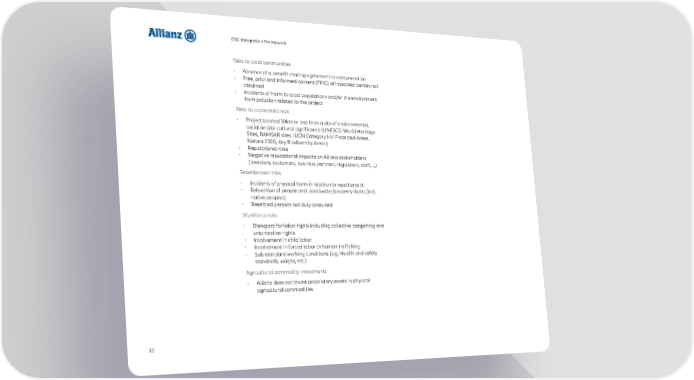 ESG Integration Framework Risks to local communities • Absence of a benefit sharing agreement or compensation • Free, prior and informed consent (FPIC) of impacted parties not obtained • Incidents of harm to local populations and/or the environment from pollution related to the project Risks to protected areas • Project located 30km or less from a site of environmental, social and/or cultural significance (UNESCO World Heritage Sites, RAMSAR sites, IUCN Category I-VI Protected Areas, Natura 2000, Key Biodiversity Areas) • Reputational risks • Negative reputational impacts on Allianz stakeholders (investors, customers, business partners, regulators, staff, ...) Resettlement risks • Incidents of physical harm in relation to resettlement • Relocation of people and land/water/property rights (incl. native peoples) • Resettled persons not duly consulted Workforce risks • Disregard for labor rights including collective bargaining and unionization rights • Involvement in child labor • Involvement in forced labor or human trafficking • Sub-standard working conditions (e.g. Health and safety standards, wages, etc.) Agricultural commodity investments • Allianz does not invest proprietary assets in physical agricultural commodities 11