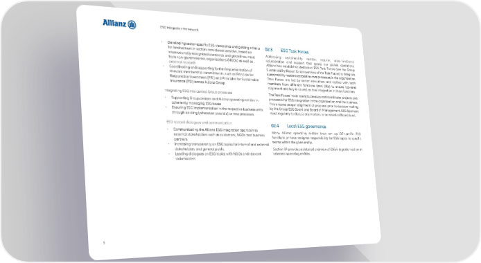 ESG Integration Framework • Developing sector-specific ESG viewpoints and guiding criteria 02.3 ESG Task Forces for involvement in sectors considered sensitive, based on Addressing sustainability matters requires cross-functional internationally recognized standards and guidelines, input collaboration and support that spans our global operations. from non-governmental organizations (NGOs) as well as Allianz has established dedicated ESG Task Forces (see the Group external research Sustainability Report for an overview of the Task Forces) to integrate • Coordinating and supporting further implementation of sustainability matters across the core processes in the organization. relevant membership commitments, such as Principle for Task Forces are led by senior executives and staffed with team Responsible Investment (PRI) and Principles for Sustainable members from different functions (and OEs) to ensure top-level Insurance (PSI) across Allianz Group alignment and buy-in as well as true integration in these functions. Integrating ESG into central Group processes The Task Forces’ main role is to develop and coordinate projects and • Supporting Group centers and Allianz operating entities in proposals for ESG integration in the organization and the business. coherently managing ESG issues This ensures proper alignment of proposal prior to decision making • Ensuring ESG implementation in the respective business units by the Group ESG Board and Board of Management. ESG Sponsors through existing (whenever possible) or new processes meet regularly to discuss any matters to be raised at Board-level. ESG related dialogues and communication 02.4 Local ESG governance • Communicating the Allianz ESG integration approach to Many Allianz operating entities have set up OE-specific ESG external stakeholders such as customers, NGOs and business functions or have assigned responsibility for ESG topics to specific partners teams within the given entity. • Increasing transparency on ESG topics for internal and external stakeholders and general public Section 04 provides a detailed overview of ESG integration action at • Leading dialogues on ESG topics with NGOs and relevant selected operating entities. stakeholders 5