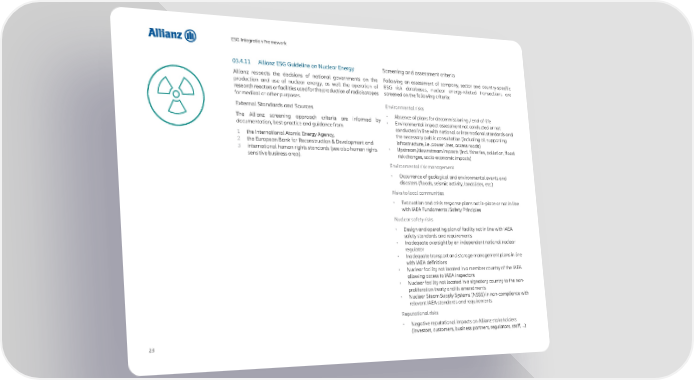 ESG Integration Framework 03.4.11 Allianz ESG Guideline on Nuclear Energy Screening and assessment criteria Allianz respects the decisions of national governments on the Following an assessment of company, sector and country-specific production and use of nuclear energy, as well the operation of ESG risk databases, nuclear energy-related transactions are research reactors or facilities used for the production of radioisotopes screened on the following criteria: for medical or other purposes. External Standards and Sources Environmental risks The Allianz screening approach criteria are informed by • Absence of plans for decommissioning / end-of-life documentation, best-practice and guidance from • Environmental impact assessment not conducted or not conducted in line with national or international standards and 1 the International Atomic Energy Agency, the necessary public consultation (including all supporting 2 the European Bank for Reconstruction & Development and infrastructure, i.e. power lines, access roads) 3 international human rights standards (see also human rights • Upstream/downstream impacts (incl. fisheries, pollution, flood sensitive business area). risk changes, socio-economic impacts) Environmental risk management • Occurrence of geological and environmental events and disasters (floods, seismic activity, landslides, etc.) Risks to local communities • Evacuation and crisis response plans not in-place or not in line with IAEA Fundamental Safety Principles Nuclear safety risks • Design and operating plan of facility not in line with IAEA safety standards and requirements • Inadequate oversight by an independent national nuclear regulator • Inadequate transport and storage management plans in line with IAEA definitions • Nuclear facility not located in a member country of the IAEA allowing access to IAEA inspectors • Nuclear facility not located in a signatory country to the non- proliferation treaty and its amendments • Nuclear Steam Supply Systems (NSSS) in non-compliance with relevant IAEA standards and requirements Reputational risks • Negative reputational impacts on Allianz stakeholders (investors, customers, business partners, regulators, staff, ...) 23