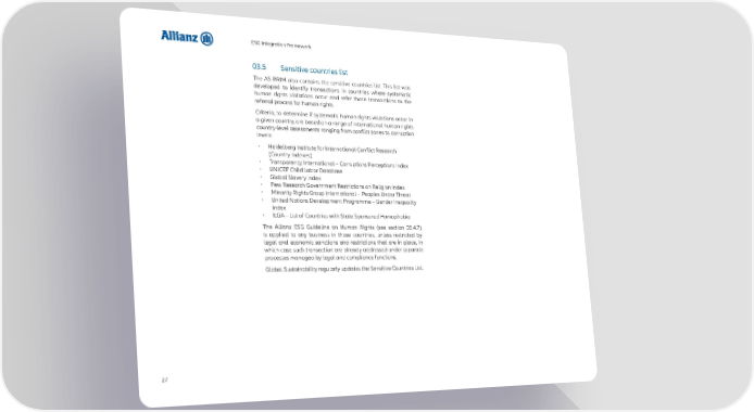 ESG Integration Framework 03.5 Sensitive countries list The AS RRIM also contains the sensitive countries list. This list was developed to identify transactions in countries where systematic human rights violations occur and refer those transactions to the referral process for human rights. Criteria, to determine if systematic human rights violations occur in a given country, are based on a range of international human rights country-level assessments ranging from conflict zones to corruption levels: • Heidelberg Institute for International Conflict Research (Country Indexes) • Transparency International – Corruptions Perceptions Index • UNICEF Child Labor Database • Global Slavery Index • Pew Research Government Restrictions on Religion Index • Minority Rights Group International – Peoples Under Threat • United Nations Development Programme – Gender Inequality Index • ILGA – List of Countries with State Sponsored Homophobia The Allianz ESG Guideline on Human Rights (see section 03.4.7) is applied to any business in those countries, unless restricted by legal and economic sanctions and restrictions that are in place, in which case such transaction are already addressed under separate processes managed by legal and compliance functions. Global Sustainability regularly updates the Sensitive Countries List. 27