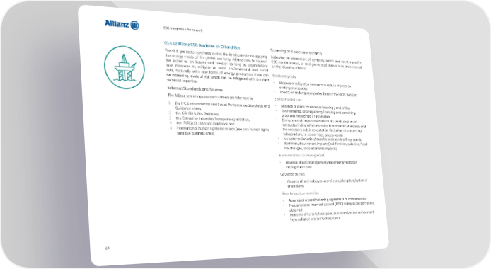 ESG Integration Framework 03.4.12 Allianz ESG Guideline on Oil and Gas Screening and assessment criteria The oil & gas sector continues to play the dominant role in supplying Following an assessment of company, sector and country-specific the energy needs of the global economy. Allianz aims to support ESG risk databases, oil and gas-related transactions are screened the sector as an insurer and investor as long as organizations on the following criteria: take measures to mitigate or avoid environmental and social risks. Naturally with new forms of energy production there can Biodiversity risks be increasing levels of risk which can be mitigated with the right • Absence of mitigation measures to reduce impacts on technical expertise. endangered species External Standards and Sources • Impact on endangered species listed in the IUCN Red List The Allianz screening approach criteria are informed by Environmental risks 1 the IFC Environmental and Social Performance Standards and • Absence of plans for decommissioning / end-of-life Guidance Notes, • Environmental and regulatory licensing and permitting 2 the GRI Oil & Gas Guidance, processes not started or incomplete 3 the Extractive Industries Transparency Initiative, • Environmental impact assessment not conducted or not 4 the IPIECA Oil and Gas Guidance and conducted in line with national or international standards and 5 international human rights standards (see also human rights the necessary public consultation (including all supporting sensitive business area). infrastructure, i.e. power lines, access roads) • No water reclamation/reuse from oil sands tailings ponds • Upstream/downstream impacts (incl. fisheries, pollution, flood risk changes, socio-economic impacts) Environmental risk management • Absence of spill management/response/remediation management plan Governance risks • Absence of anti-bribery and anti-corruption plans/systems/ procedures Risks to local communities • Absence of a benefit sharing agreement or compensation • Free, prior and informed consent (FPIC) of impacted parties not obtained • Incidents of harm to local populations and/or the environment from pollution related to the project 24