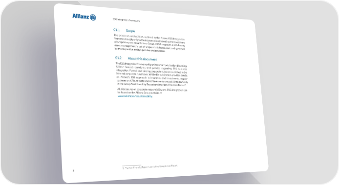 ESG Integration Framework 01.1 Scope The processes and policies outlined in the Allianz ESG Integration Framework apply only to the insurance lines as well as the investment of proprietary assets of Allianz Group. ESG integration in third-party asset management is out of scope of this framework and governed by the respective entity’s policies and processes. 01.2 About this document The ESG Integration Framework is an important publication disclosing Allianz Group’s standards and policies regarding ESG business integration. Formal and binding corporate rules are published in the internal corporate rules book. While this publication provides details on Allianz’s ESG approach in insurance and investments, regular updates on KPIs, targets and achievements are published annually 1 in the Group Sustainability Report and the Non-Financial Report . All disclosures on corporate responsibility and ESG integration can be found on the Allianz Group website at www.allianz.com/sustainability. 3 1 The Non-Financial Report is part of the Group Annual Report.