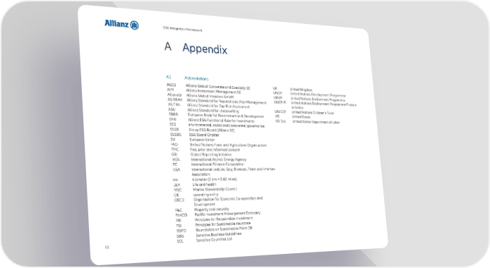ESG Integration Framework A Appendix A1 Abbreviations AGCS Allianz Global Corporate and Specialty SE UK United Kingdom AIM Allianz Investment Management SE UNDP United Nations Development Programme AllianzGI Allianz Global Investors GmbH UNEP United Nations Environment Programme AS RRIM Allianz Standard for Reputational Risk Management UNEP-FI United Nations Environment Programme Finance AS TRA Allianz Standard for Top Risk Assessment Initiative ASU Allianz Standard for Underwriting UNICEF United Nations Children’s Fund EBRD European Bank for Reconstruction & Development US United States EFRI Allianz ESG Functional Rule for Investments US DoL United States Department of Labor ESG environmental, social and (corporate) governance ESGB Group ESG Board (Allianz SE) ESGBC ESG Board Charter EU European Union FAO United Nations Food and Agriculture Organization FPIC free, prior and informed consent GRI Global Reporting Initiative IAEA International Atomic Energy Agency IFC International Finance Corporation ILGA International Lesbian, Gay, Bisexual, Trans and Intersex Association km kilometer (1 km = 0.62 miles) L&H Life and health MSC Marine Stewardship Council OE operating entity OECD Organisation for Economic Co-operation and Development P&C Property and casualty PIMCO Pacific Investment Management Company PRI Principles for Responsible Investment PSI Principles for Sustainable Insurance RSPO Roundtable on Sustainable Palm Oil SBG Sensitive Business Guidelines 51 SCL Sensitive Countries List
