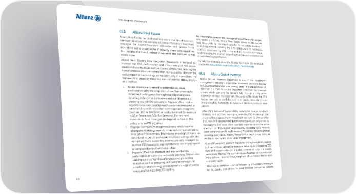 ESG Integration Framework 05.3 Allianz Real Estate As a responsible investor and manager of one of the world’s largest Allianz Real Estate, our dedicated real estate investment and asset real estate portfolios, Allianz Real Estate strives to incorporate manager, develops and executes tailored portfolios and investment ESG factors into its investment cycle for its real estate business. It strategies for Allianz insurance companies and pension funds is working towards reducing the GHG emissions of its real estate around the world, as well as for third-party clients with capabilities portfolio to net zero by 2050, in line with the Group’s commitment, that include direct and indirect investments and commercial real and increasing the share of properties that have an environmental estate loans. or sustainability certification. Allianz Real Estate’s ESG integration framework is designed to For additional details about the Allianz Real Estate ESG approach, improve the ESG performance and transparency of real estate please see www.allianz-realestate.com/en/Sustainability. assets and address issues such as physical climate risks, reducing the risks of obsolescence and depreciation. Alongside this, it looks at the 05.4 Allianz Global Investors social impact of the buildings on the community that uses them. The Allianz Global Investors (AllianzGI) is one of the investment framework is based on three key areas of activity: assess, engage management industry’s responsible investment pioneers, tracing and improve. its ESG credentials back over twenty years . It is the conviction of 1 Assess: Assets are screened for potential ESG issues, AllianzGI that ESG factors are important investment performance particularly during the acquisition phase. Every new equity drivers which can only be realized fully through a truly active investment undergoes a thorough due diligence process approach to asset management. Recognizing the value that ESG including technical and environmental due diligence and factors can add to portfolios and to its clients, AllianzGI aims at property-related ESG assessment. Any new office, retail or integrating ESG factors into all investment decisions, across all asset logistics investment (equity) must have an environmental or classes. sustainability certification that is either globally recognized AllianzGI’s dedicated Sustainability team works hand in hand with (such as LEED or BREEAM) or locally dominant (for example analysts and portfolio managers, providing ESG knowledge and HQE in France and DGNB in Germany). For new fund insights that support better investment decisions as they consider investments, fund managers are required to have an ESG ESG risks and opportunities that may not have been fully priced by policy or to be PRI signatory. the markets. The team offers specialist expertise across the entire 2 Engage: During the management phase, a collaborative spectrum of ESG-related requirements, including: ESG research engagement strategy seeks to influence business partners to (both company-specific and thematic), Proprietary ESG rating model strengthen ESG activities. This includes ensuring ESG topics are covering over 10,000 issuers, Research to support proxy voting as considered as part of performance review meetings with joint well as company and policy-level engagement. venture partners, supporting external property managers to improve ESG standards and performance, and engaging with AllianzGI’s research platform facilitates and systematically records tenants to influence their choice in fuel. its international network of investors debating and assessing ESG 3 Improve: We aim to measure and improve the ESG risks and opportunities on a global universe of corporate issuers, performance of our entire real estate portfolio. This includes sectors and themes. The platform allows AllianzGI to “crowdsource” seeking out pilot ‘lighthouse’ projects and group-wide insights from the entire firm, giving them a truly holistic view on each initiatives, such as procuring certified green energy and and every issuer. investing in onsite energy production and energy efficiency AllianzGI is committed to active stewardship of the assets it manages measures like installing LED lighting. for its clients, and strives to steer investee companies towards 45