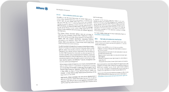 ESG Integration Framework 04.4.4 Data protection and human rights use of social media. According to the Universal Declaration of Human Rights and to In response to the increasing regulatory initiatives and public several other international treaties, data privacy is a fundamental debates on ethics and artificial intelligence (“AI”) worldwide, we human right. As such, Allianz takes data privacy and protection have set up the Allianz Data Ethics Project including experts from risks very seriously, and it is enforcing robust security and privacy various functions and Allianz Group companies. Aiming to further controls to give its customers comfort that their personal data is strengthen the internal governance framework for AI, in 2020 we safe and secure. At Allianz SE, data privacy matters are managed developed an AI Practical Guidance for our data science/analytics by the Group Privacy function which is also responsible for the departments, extended our risk assessment activities to include Allianz Privacy Standard and compliance with different regulatory ethical assessments. developments. For further details, please see the Group Sustainability Report at The Allianz Privacy Standard defines rules and principles for www.allianz.com/sustainability. collecting and processing personal data. Established in 2018, it sets out six privacy principles Allianz expects all its employees to 04.5 Remedy and grievance mechanism respect due care, purpose specification, reasonable limitation, transparency and openness, choice and consent, and privacy by Allianz aims to identify, prevent, or mitigate adverse human rights design. Allianz also publishes a Privacy Notice, which clearly states impacts linked to its business activities and operations. In concrete what information we collect and why. terms, Allianz seeks to: Equally important is the security of the personal data Allianz handles. • Apply its responsibilities across all its business activities As part of its robust Information Security Framework, Allianz entities • Engage in continuous dialogue with stakeholders to ensure on- globally apply strict security processes, standards, and tools. The going improvement framework also defines minimum requirements that are based on • Develop grievance mechanisms for all stakeholders in relevant the ISO 27001 Standard for information security management. This countries and business units standard specifies various requirements for three fields: vulnerability • Regularly assess human rights risks and perform human rights assessment along the software development value chain (including due diligence penetration tests and security audits), systems monitoring via multi- • Remedy any adverse human rights impacts for which Allianz is level security systems, and effective IT security management and responsible for business continuity management. • Track performance about human rights impacts and remedies. Allianz keeps abreast of regulatory and industry developments and Internal and external stakeholders are given the opportunity to raise aims to reflect these in its operational and governance processes allegations of human rights violations involving Allianz through our and procedures. For example, in response to the changes in the EU Group-level complaint system. Human rights-related complaints General Data Protection Regulation (GDPR) that came into force will then be investigated and addressed by Group Compliance, in in May 2018, the Allianz Privacy Renewal Program (APRP) was certain cases supported by the Global Sustainability function. initiated – a major effort to align Allianz’s privacy practices with the Details about the grievance mechanism process or to file a human requirements of the GDPR. rights-related grievance please see our human rights page at Additionally, Allianz addresses new data privacy developments in www.allianz.com/en/sustainability/articles/human-rights.html different jurisdictions where Allianz does business. This includes for example, responding to judicial and regulatory statements on the 43 GDPR, including concerns about cross-border data transfers and the