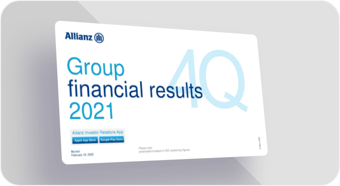 Group financial results 2021 Allianz Investor Relations App Apple App Store Google Play Store 2022 Munich Please note: lianz February 18, 2022 presentations based on 2021 preliminary figures © Al