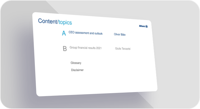 Content/topics A CEO assessment and outlook Oliver Bäte B Group financial results 2021 Giulio Terzariol Glossary Disclaimer
