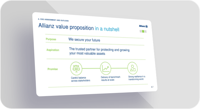 A. CEO ASSESSMENT AND OUTLOOK Allianz value proposition in a nutshell Purpose We secure your future Aspiration The trusted partner for protecting and growing your most valuable assets Promise Careful balance Delivery of benchmark Strong resilience in a across stakeholders results at scale transforming world 9 A 7
