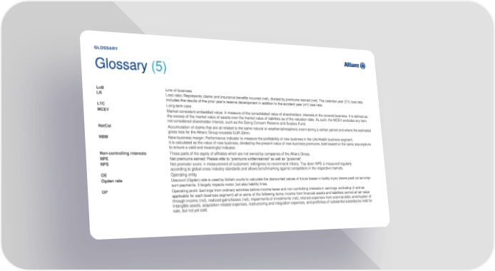 GLOSSARY Glossary (5) LoB Line of business LR Loss ratio: Represents claims and insurance benefits incurred (net), divided by premiums earned (net). The calendar year (CY) loss ratio includes the results of the prior year’s reserve development in addition to the accident year (AY) loss ratio. LTC Long-term care MCEV Market-consistent embedded value: A measure of the consolidated value of shareholders’ interests in the covered business. It is defined as the excess of the market value of assets over the market value of liabilities as of the valuation date. As such, the MCEV excludes any item not considered shareholder interest, such as the Going Concern Reserve and Surplus Fund. NatCat Accumulation of claims that are all related to the same natural or weather/atmospheric event during a certain period and where the estimated gross loss for the Allianz Group exceeds EUR 20mn. NBM New-business margin: Performance indicator to measure the profitability of new business in the Life/Health business segment. It is calculated as the value of new business, divided by the present value of new-business premiums, both based on the same assumptions to ensure a valid and meaningful indicator. Non-controlling interests Those parts of the equity of affiliates which are not owned by companies of the Allianz Group. NPE Net premiums earned: Please refer to “premiums written/earned” as well as “gross/net”. NPS Net promoter score: A measurement of customers’ willingness to recommend Allianz. Top-down NPS is measured regularly according to global cross-industry standards and allows benchmarking against competitors in the respective markets. OE Operating entity Ogden rate Discount (Ogden) rate is used by British courts to calculate the discounted values of future losses in bodily injury claims paid out as lump- sum payments. It largely impacts motor, but also liability lines. OP Operating profit: Earnings from ordinary activities before income taxes and non-controlling interests in earnings, excluding (if and as applicable for each business segment) all or some of the following items: income from financial assets and liabilities carried at fair value through income (net), realized gains/losses (net), impairments of investments (net), interest expenses from external debt, amortization of intangible assets, acquisition-related expenses, restructuring and integration expenses, and profit/loss of substantial subsidiaries held for sale, but not yet sold.