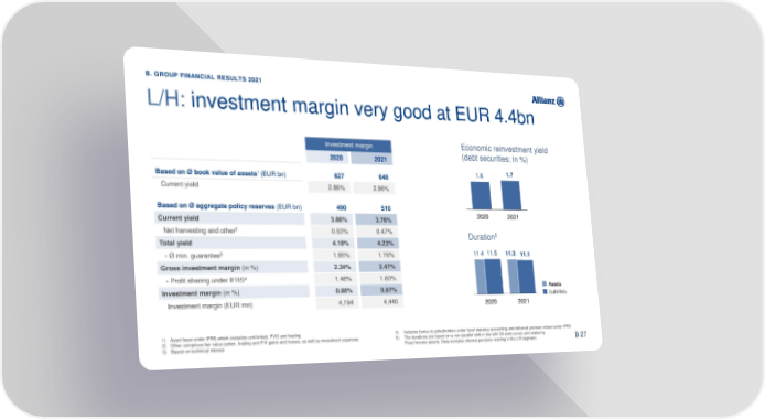 B. GROUP FINANCIAL RESULTS 2021 L/H: investment margin very good at EUR 4.4bn Investment margin Economic reinvestment yield 2020 2021 (debt securities; in %) 1 1.6 1.7 Based on Ø book value of assets (EUR bn) 627 648 Current yield 2.86% 2.96% Based on Ø aggregate policy reserves (EUR bn) 490 510 Current yield 3.66% 3.76% 2020 2021 Net harvesting and other2 0.53% 0.47% 5 Total yield 4.18% 4.23% Duration - Ø min. guarantee3 1.85% 1.76% 11.4 11.5 11.3 11.1 Gross investment margin (in %) 2.34% 2.47% 4 - Profit sharing under IFRS 1.48% 1.60% Investment margin (in %) 0.86% 0.87% Assets Liabilities Investment margin (EUR mn) 4,194 4,440 2020 2021 1) Asset base under IFRS which excludes unit-linked, FVO and trading 4) Includes bonus to policyholders under local statutory accounting and deferred premium refund under IFRS 2) Other comprises fair value option, trading and F/X gains and losses, as well as investment expenses 5) The durations are based on a non-parallel shift in line with SII yield curves and scaled by 45 3) Based on technical interest Fixed Income assets. Data excludes internal pensions residing in the L/H segment. B 27
