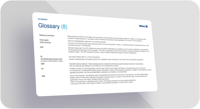 GLOSSARY Glossary (8) Statutory premiums Gross premiums written from the sales of life and health insurance policies, as well as gross receipts from sales of unit-linked and other investment-related products, in accordance with the statutory accounting principles applicable in the insurer’s home jurisdiction. Total equity The sum of shareholders’ equity and non-controlling interests. Total revenues The sum of P/C total revenues (gross premiums written & fee and commission income), L/H statutory premiums, operating revenues in AM and total revenues in CO (Banking). UFR Ultimate forward rate: The UFR is determined using the EIOPA methodology and guidelines, and is used for extrapolation of periods after the last liquid point defined by the SII regulation. The UFR is calculated for each currency based on expected real rates and inflation for the respective region. The UFR is subject to revision in order to reflect fundamental changes in long term expectations. UL Unit-linked: Please refer to “L/H lines of business”. Unrealized gains/losses (net) Include unrealized gains and losses primarily from available-for-sale investments, net of taxes and of policyholder participation. (as part of shareholders’ equity) URR Unearned revenue reserves: These comprise premium components (other than expense loadings) that refer to future periods. They are reserved and released over the lifetime of the corresponding contracts. VA Variable annuities: The benefits payable under this type of life insurance depend primarily on the performance of the investments in a mutual fund. The policyholder shares equally in the profits or losses of the underlying investments. In addition, the contracts can include separate guarantees, such as guaranteed death, withdrawal, accumulation or income benefits. VNB Value of new business: The additional value to shareholders that results from the writing of new business. The VNB is determined as present value of future profits, adjusted for acquisition expenses overrun or underrun, minus the time value of financial options and guarantees, minus a risk margin, all determined at issue date. Value of new business is calculated at point of sale, interpreted as at beginning of each quarter assumptions. In the case of the USA a more frequent valuation, using updated assumptions, is performed (bi-weekly).