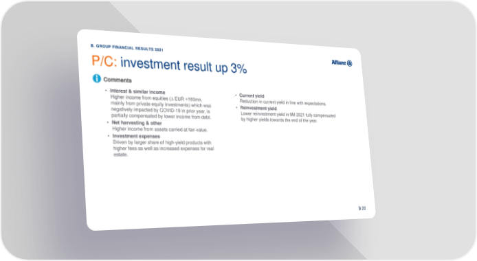 B. GROUP FINANCIAL RESULTS 2021 P/C: investment result up 3% Comments • Interest & similar income • Current yield Higher income from equities (∆ EUR +160mn, Reduction in current yield in line with expectations. mainly from private equity investments) which was • Reinvestment yield negatively impacted by COVID-19 in prior year, is Lower reinvestment yield in 9M 2021 fully compensated partially compensated by lower income from debt. by higher yields towards the end of the year. • Net harvesting & other Higher income from assets carried at fair-value. • Investment expenses Driven by larger share of high-yield products with higher fees as well as increased expenses for real estate. 38 B 20