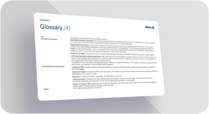 GLOSSARY Glossary (4) L/H (The Allianz business segment) Life and Health insurance L/H lines of business Guaranteed savings & annuities: Life insurance products linked to life expectancy, offering life and / or death benefits in the form of single or multiple payments to beneficiaries and possibly including financial and non-financial guarantees. Capital-efficient products: Products that are based on the general account but involve a significantly lower market risk, either through comprehensive asset/liability management or through significant limitation of the guarantee. This also includes hybrid products which, in addition to conventional assets, invest in a separate account (unit-linked). Capital-efficient products offer a guaranteed surrender value at limited risk, due to, e.g. precise asset-liability management or market value adjustment. Protection & health: Insurance products covering the risks associated with events that affect an individual’s physical or mental integrity. Unit-linked [products] without guarantees: With conventional unit-linked products, all benefits under the contract are directly linked to the value of a set of assets which are pooled in an internal or external fund and held in a separate account by the insurer. In this constellation, it is the policyholder rather than the insurer who bears the risk. The objective of the “Life/Health operating profit sources” analysis is to explain movements in IFRS results by analyzing underlying drivers of performance, consolidated for the Life/Health business segment. L/H operating profit sources Loadings & fees: Includes premium and reserve-based fees, unit-linked management fees, and policyholder participation in expenses (if and as applicable). Investment margin: Is defined as IFRS investment income, net of expenses, less interest credited to IFRS reserves as well as policyholder participation in the investment result. Expenses: Includes commissions, acquisition, and administration expenses. Technical margin: Comprises risk result (risk premiums less benefits in excess of reserves), lapse result (surrender charges and commission clawbacks) and reinsurance result, all net of policyholder participation (as applicable). Impact of change in DAC: Represents the net impact of the deferral and amortization of both acquisition costs and front-end loadings on operating profit. Includes effects of changes in DAC and URR. LatAm Latin America: South America and Mexico