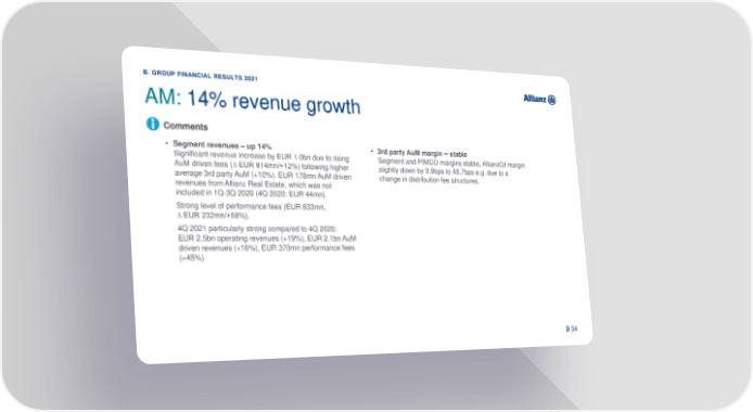 B. GROUP FINANCIAL RESULTS 2021 AM: 14% revenue growth Comments • Segment revenues – up 14% • 3rd party AuM margin – stable Significant revenue increase by EUR 1.0bn due to rising Segment and PIMCO margins stable, AllianzGI margin AuMdriven fees (∆ EUR 814mn/+12%) following higher slightly down by 0.9bps to 46.7bps e.g. due to a average 3rd party AuM (+10%). EUR 178mn AuM driven change in distribution fee structures. revenues from Allianz Real Estate, which was not included in 1Q-3Q 2020 (4Q 2020: EUR 44mn). Strong level of performance fees (EUR 633mn, ∆ EUR 232mn/+58%). 4Q 2021 particularly strong compared to 4Q 2020: EUR 2.5bn operating revenues (+19%), EUR 2.1bn AuM driven revenues (+16%), EUR 370mn performance fees (+45%). 52 B 34