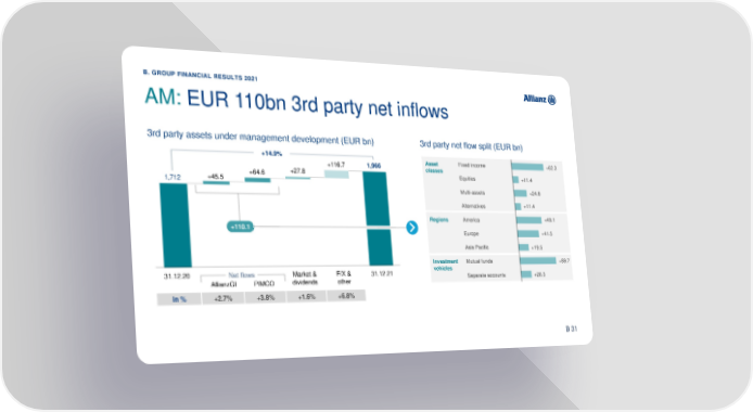 B. GROUP FINANCIAL RESULTS 2021 AM: EUR 110bn 3rd party net inflows 3rd party assets under management development (EUR bn) 3rd party net flow split (EUR bn) +14.9% Asset Fixed income +62.3 +116.7 1,966 classes +64.6 +27.8 Equities +11.4 1,712 +45.5 Multi-assets +24.8 Alternatives +11.4 Regions America +49.1 +110.1 Europe +41.5 Asia Pacific +19.5 Investment Mutual funds +89.7 31.12.20 Net flows Market & F/X & 31.12.21 vehicles AllianzGI PIMCO dividends other Separate accounts +20.3 in % +2.7% +3.8% +1.6% +6.8% 49 B 31