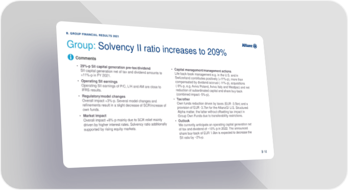 B. GROUP FINANCIAL RESULTS 2021 Group: Solvency II ratio increases to 209% Comments • 29%-p SII capital generation pre-tax/dividend • Capital management/management actions SII capital generation net of tax and dividend amounts to Life back-book management e.g. in the U.S. and in +11%-p in FY 2021. Switzerland contributes positively (+11%-p), more than • Operating SII earnings compensated by dividend accrual (-11%-p), acquisitions Operating SII earnings of P/C, L/H and AM are close to (-9%-p, e.g. Aviva Poland, Aviva Italy and Westpac) and net IFRS results. reduction of subordinated capital and share buy-back • Regulatory/model changes (combined impact -5%-p). Overall impact +3%-p. Several model changes and • Tax/other refinements result in a slight decrease of SCR/increase of Own funds reduction driven by taxes (EUR -3.5bn) and a own funds. provision of EUR -3.7bn for the AllianzGI U.S. Structured Alpha matter, the latter without offsetting tax impact in • Market impact Group Own Funds due to transferability restrictions. Overall impact +8%-p mainly due to SCR relief mainly • Outlook driven by higher interest rates. Solvency ratio additionally We currently anticipate an operating capital generation net supported by rising equity markets. of tax and dividend of ~10%-p in 2022. The announced share buy-back of EUR 1.0bn is expected to decrease the SII ratio by ~2%-p. 28 B 10