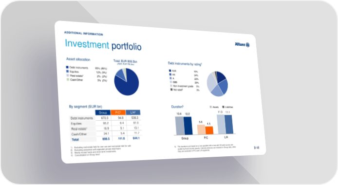 ADDITIONAL INFORMATION Investment portfolio Asset allocation Total: EUR 808.5bn Debt instruments by rating2 (2020: EUR 790.3bn) Debt instruments 83% (86%) AAA 18% Equities 12% (9%) AA 24% 1 Real estate 2% (2%) A 22% Cash/Other 3% (3%) BBB 29% Non-investment grade 5% Not rated3 3% By segment (EUR bn) 5 Assets Liabilities Duration 4 4 11.3 Group P/C L/H 10.4 10.2 11.1 Debt instruments 672.3 94.8 538.3 Equities 95.2 8.4 81.0 5.6 4.5 1 Real estate 16.9 3.1 13.1 Cash/Other 24.1 5.4 11.7 Total 808.5 111.6 644.1 Group P/C L/H 1) Excluding real estate held for own use and real estate held for sale 2) Excluding seasoned self-originated private retail loans 5) The durations are based on a non-parallel shift in line with SII yield curves and 3) Mostly mutual funds and short-term investments scaled by fixed income assets. Internal pensions are included in Group data, while 66 4) Consolidated on Group level they are excluded in P/C and L/H segments B 48