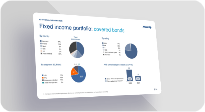 ADDITIONAL INFORMATION Fixed income portfolio: covered bonds By country Total By rating EUR 55.6bn Germany 38% AAA 77% France 15% AA 22% Spain 6% A 0% Italy 5% BBB 1% UK 3% Non-investment grade 0% Rest of World 33% Not rated 0% By segment (EUR bn) 6.0 0.0 AFS unrealized gains/losses (EUR bn) 3.4 10.7 L/H 70% 38.9 1.5 P/C 19% Corporate and other 11% Gross unrealized gains/losses 0.8 0.3 Asset Management 0% Net unrealized gains/losses1 2020 2021 72 1) On-balance sheet unrealized gains/losses after tax, non-controlling interests and policyholders, and before shadow accounting B 54