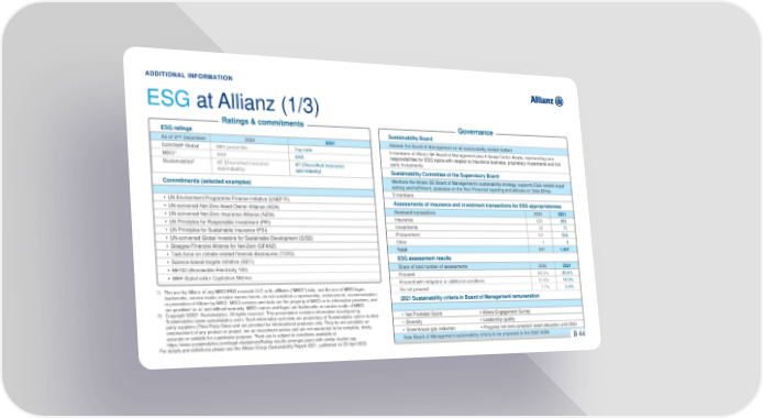 ADDITIONAL INFORMATION ESGat Allianz (1/3) Ratings & commitments Governance ESG ratings Sustainability Board st As of 31 December 2020 2021 Advises the Board of Management on all sustainability related matters DJSI/S&P Global 98th percentile Top rank 5 members of Allianz SE Board of Management plus 4 Group Center Heads, representing core 1 responsibilities for ESG topics with respect to insurance business, proprietary investments and 3rd MSCI AAA AAA party investments Sustainalytics² #2 (Diversified insurance #7 (Diversified insurance sub-industry) sub-industry) Sustainability Committee of the Supervisory Board Commitments (selected examples) Monitors the Allianz SE Board of Management’s sustainability strategy, supports ESG-related target setting and fulfillment, assesses on the Non-Financial reporting and advises on Data Ethics 5 members • UN Environment Programme Finance Initiative (UNEP FI) Assessments of insurance and investment transactions for ESG appropriateness • UN-convened Net-Zero Asset Owner Alliance (AOA) Assessed transactions 2020 2021 • UN-convened Net-Zero Insurance Alliance (NZIA) Insurance 430 850 • UN Principles for Responsible Investment (PRI) Investments 65 71 • UN Principles for Sustainable Insurance (PSI) Procurement 101 526 • UN-convened Global Investors for Sustainable Development (GISD) Other 1 0 • Glasgow Financial Alliance for Net-Zero (GFANZ) Total 597 1,447 • Task force on climate-related financial disclosures (TCFD) ESG assessmentresults • Science-based targets initiative (SBTi) • RE100 (Renewable Electricity 100) Share of total number of assessments 2020 2021 • WEF Stakeholder Capitalism Metrics Proceed 60.5% 80.6% Proceed with mitigation or additional conditions 31.8% 14.0% 1) The use by Allianz of any MSCI ESG research LLC or its affiliates (“MSCI”) data, and the use of MSCI logos, Do not proceed 7.7% 5.4% trademarks, service marks or index names herein, do not constitute a sponsorship, endorsement, recommendation, 2021Sustainability criteria in Board of Management remuneration or promotion of Allianz by MSCI. MSCI services and data are the property of MSCI or its information providers, and are provided ‘as-is’ and without warranty. MSCI names and logos are trademarks or service marks of MSCI. 2) Copyright ©2021 Sustainalytics. All rights reserved. This presentation contains information developed by • Net Promoter Score Allianz Engagement Survey Sustainalytics (www.sustainalytics.com). Such information and data are proprietary of Sustainalytics and/or its third party suppliers (Third Party Data) and are provided for informational purposes only. They do not constitute an • Diversity Leadership quality endorsement of any product or project, nor an investment advice and are not warranted to be complete, timely, • Greenhouse gas reduction Progress net-zero compliant asset allocation until 2050 accurate or suitable for a particular purpose. Their use is subject to conditions available at https://www.sustainalytics.com/legal-disclaimersRating results amongst peers with similar market cap. New Board of Management sustainability criteria to be proposed at the 2022 AGM. B 44 For details and definitions please see the Allianz Group Sustainability Report 2021, published on 29 April 2022.