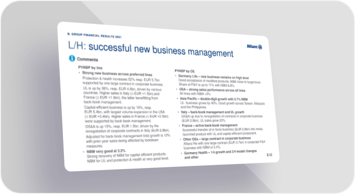 B. GROUP FINANCIAL RESULTS 2021 L/H: successful new business management Comments PVNBP by line PVNBP by OE • Strong new business across preferred lines • Germany Life – new business remains on high level Protection & health increases 52% resp. EUR 5.7bn Good acceptance of modified products. NBM close to target level. supported by one large contract in corporate business. Share of P&H is up to 11% with NBM 6.8%. UL is up by 36%, resp. EUR 4.8bn, driven by various • USA –strong sales performance across all lines All lines with NBM >3%. countries. Higher sales in Italy (∆ EUR +1.5bn) and France (∆ EUR +1.9bn), the latter benefitting from • Asia Pacific – double-digit growth with 5.7% NBM back-book management. UL business grows by 40%. Good growth across Taiwan, Malaysia Capital-efficient business is up by 19%, resp. and the Philippines. EUR 5.4bn, with largest volume expansion in the USA • Italy – back-book management and UL growth (∆ EUR +3.4bn). Higher sales in France (∆ EUR +2.0bn) GS&A up due to renegotiation of contracts in corporate business were supported by back-book management. (EUR 2.8bn). UL sales grow 23%. GS&A is up 15%, resp. EUR 1.3bn, driven by the • France – active back-book management renegotiation of corporate contracts in Italy (EUR 2.8bn). Successful transfer of in-force business (EUR 2.8bn) into newly Adjusted for back-book management total growth is 12% launched product with UL and capital-efficient component. with prior-year sales being affected by lockdown • Other OEs – large contract in corporate business measures. Allianz Re with one large contract (EUR 3.7bn) in corporate P&H • NBM very good at 3.2% business with NBM of 3.4%. Strong recovery of NBM for capital-efficient products. • Germany Health – 1/4 growth and 3/4 model changes NBM for UL and protection & health at very good level. and other 40 B 22