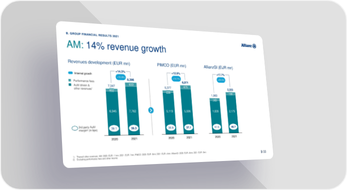 B. GROUP FINANCIAL RESULTS 2021 AM: 14% revenue growth Revenues development (EUR mn) PIMCO (EUR mn) AllianzGI (EUR mn) +14.3% +12.9% +17.7% Internal growth +15.9% +14.1% +20.5% Performance fees 8,396 6,071 AuMdriven & 7,347 633 5,377 475 other revenues1 402 2,333 258 1,983 158 143 6,945 7,762 5,119 5,596 1,839 2,175 3rd party AuM 39.1 39.3 36.9 37.1 47.6 46.7 margin2 (in bps) 2020 2021 2020 2021 2020 2021 1) Thereof other revenues: AM: 2020: EUR -11mn; 2021: EUR -7mn; PIMCO: 2020: EUR -6mn; 2021: EUR +4mn; AllianzGI: 2020: EUR +6mn; 2021: EUR -3mn 51 2) Excluding performance fees and other income B 33
