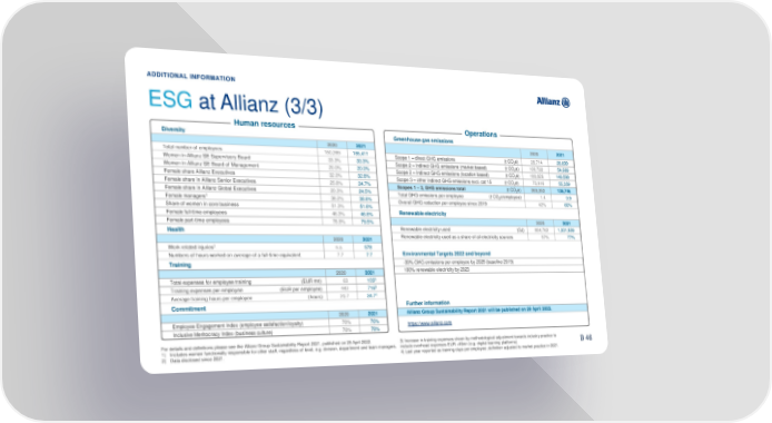 ADDITIONAL INFORMATION ESGat Allianz (3/3) Human resources Operations Diversity Greenhouse gasemissions 2020 2021 2020 2021 Total number of employees 150,269 155,411 Scope 1 – direct GHG emissions (t CO e) 28,714 28,699 Women in Allianz SE Supervisory Board 33.3% 33.3% 2 Women in Allianz SE Board of Management 20.0% 20.0% Scope 2 – indirect GHG emissions (market based) (t CO2e) 100,722 54,689 Female share Allianz Executives 32.0% 32.8% Scope 2 – indirect GHG emissions (location based) (t CO2e) 180,826 149,599 Female share in Allianz Senior Executives 25.8% 24.7% Scope 3 – other indirect GHG emissions excl. cat 15 (t CO2e) 73,916 55,359 Female share in Allianz Global Executives 20.3% 24.5% Scopes 1 – 3, GHG emissions total (t CO2e) 203,352 138,746 Total GHG emissions per employee (t CO2e/employee) 1.4 0.9 Female managers1 38.2% 38.6% Overall GHG reduction per employee since 2019 42% 60% Share of women in core business 51.3% 51.6% Female full-time employees 46.3% 46.6% Renewable electricity Female part-time employees 78.9% 79.5% 2020 2021 Health Renewable electricity used (GJ) 854,762 1,001,859 2020 2021 Renewable electricity used as a share of all electricity sources 57% 77% Work related injuries2 n.a. 578 Numbers of hours worked on average of a full-time equivalent 7.7 7.7 Environmental Targets 2022and beyond Training -30% GHG emissions per employee by 2025 (baseline 2019) 2020 2021 100% renewable electricity by 2023 3 Total expenses for employee training (EUR mn) 63 103 3 Training expenses per employee (EUR per employee) 442 716 4 Average training hours per employee (hours) 20.7 34.7 Commitment Further information 2020 2021 Allianz Group Sustainability Report 2021 will be published on 29 April 2022. Employee Engagement Index (employee satisfaction/loyalty) 78% 76% https://www.allianz.com Inclusive Meritocracy Index (business culture) 78% 78% For details and definitions please see the Allianz Group Sustainability Report 2021, published on 29 April 2022. 3) Increase in training expenses driven by methodological adjustment towards industry practice to B 46 1) Includes women functionally responsible for other staff, regardless of level, e.g. division, department and team managers. include overhead expenses EUR +46mn (e.g. digital learning platforms). 2) Data disclosed since 2021. 4) Last year reported as training days per employee; definition adjusted to market practice in 2021. .