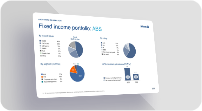ADDITIONAL INFORMATION Fixed income portfolio: ABS By type of issuer Total By rating EUR 28.8bn CMBS 45% AAA 61% CMO/CDO 23% AA 23% US Agency 13% A 8% RMBS 2% BBB 6% Auto 2% Non-investment grade 2% Credit Card 0% Not rated 0% Other 16% By segment (EUR bn) 1.5 0.0 AFS unrealized gains/losses (EUR bn) 1.4 5.2 L/H 77% 0.7 P/C 18% 22.1 Corporate and other 5% Gross unrealized gains/losses 1.1 0.5 Asset Management 0% Net unrealized gains/losses1 2020 2021 74 1) On-balance sheet unrealized gains/losses after tax, non-controlling interests, policyholders and before shadow accounting B 56