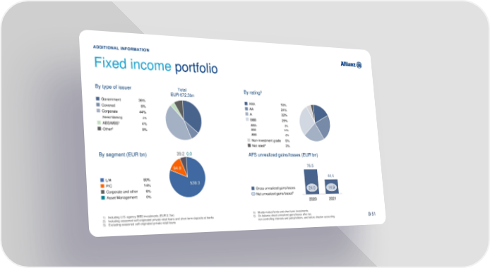 ADDITIONAL INFORMATION Fixed income portfolio By type of issuer Total By rating3 EUR 672.3bn Government 36% AAA 18% Covered 8% AA 24% Corporate 44% A 22% thereof Banking 5% BBB 29% 1 BBB+ 9% ABS/MBS 4% Other2 8% BBB 14% BBB- 6% Non-investment grade 5% Not rated4 3% By segment (EUR bn) 39.2 0.0 AFS unrealized gains/losses (EUR bn) 94.8 76.5 L/H 80% 44.4 P/C 14% 538.3 Corporate and other 6% Gross unrealized gains/losses 24.0 14.9 Asset Management 0% Net unrealized gains/losses5 2020 2021 1) Including U.S. agency MBS investments (EUR 3.7bn) 4) Mostly mutual funds and short-term investments 2) Including seasoned self-originated private retail loans and short-term deposits at banks 5) On-balance sheet unrealized gains/losses after tax, 69 3) Excluding seasoned self-originated private retail loans non-controlling interests and policyholders, and before shadow accounting B 51