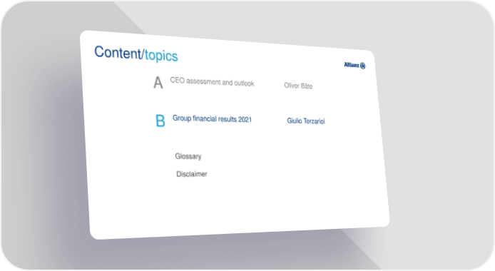Content/topics A CEO assessment and outlook Oliver Bäte B Group financial results 2021 Giulio Terzariol Glossary Disclaimer