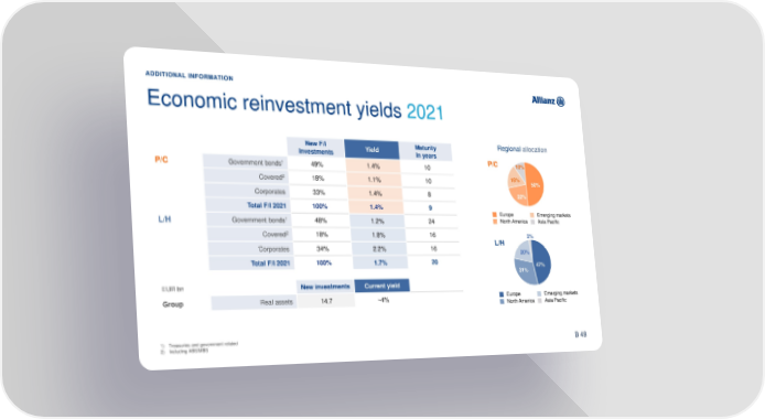 ADDITIONAL INFORMATION Economic reinvestment yields 2021 New F/I Yield Maturity Regional allocation investments in years P/C P/C Government bonds1 49% 1.4% 10 10% Covered2 18% 1.1% 10 18% 50% Corporates 33% 1.4% 8 22% Total F/I 2021 100% 1.4% 9 Europe Emerging markets L/H Government bonds1 48% 1.2% 24 North America Asia Pacific Covered2 18% 1.8% 16 2% Corporates 34% 2.2% 16 L/H 20% Total F/I 2021 100% 1.7% 20 47% 31% EUR bn New investments Current yield Group Real assets 14.7 ~4% Europe Emerging markets North America Asia Pacific 1) Treasuries and government related 67 2) Including ABS/MBS B 49