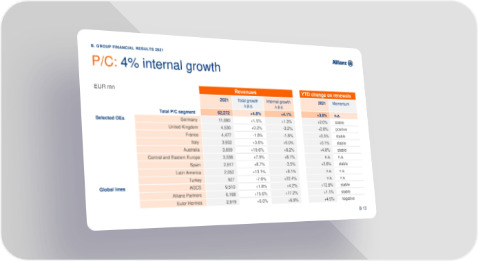 B. GROUP FINANCIAL RESULTS 2021 P/C: 4% internal growth EUR mn Revenues YTD change on renewals 2021 Total growth Internal growth 2021 Momentum ∆ p.y. ∆ p.y. Total P/C segment 62,272 +4.8% +4.1% +3.6% n.a. Selected OEs Germany 11,080 +1.5% +1.3% +2.0% stable United Kingdom 4,530 +0.2% -3.2% +2.8% positive France 4,477 -1.8% -1.8% +0.5% stable Italy 3,932 +3.6% +0.0% +0.1% stable Australia 3,659 +19.6% +8.2% +4.8% stable Central and Eastern Europe 3,538 +7.9% +8.1% n.a. n.a. Spain 2,517 +8.7% -3.5% +3.6% stable Latin America 2,052 +13.1% +8.1% n.a. n.a. Turkey 927 -7.6% +22.4% n.a. n.a. Global lines AGCS 9,510 +1.8% +4.2% +12.8% stable Allianz Partners 6,168 +15.6% +17.2% +1.1% stable Euler Hermes 2,919 +6.0% +6.9% +4.5% negative 31 B 13