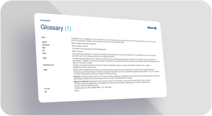 GLOSSARY Glossary (1) AFS Available for sale: Available-for-sale investments are non-derivative financial assets which have been acquired neither for sale in the near term nor to be held to maturity. They are shown at fair value on the balance sheet. AGCS Allianz Global Corporate & Specialty AllianzGI Allianz Global Investors AM (The Allianz business segment) Asset Management AP Allianz Partners APE Annual premium equivalent: A measure to normalize single premiums to the recurring premiums. It is calculated as the sum of recurring premiums and 10% of single premiums of the respective period. APR Accident insurance with premium refund (“Unfallversicherung mit Beitragsrückzahlung”): Special form of accident insurance where the policyholder, in addition to insurance coverage for accidents, has a guaranteed claim to the refund of premiums, either at the agreed maturity date or in the event of death. Attritional LR Accident year losses less claims arising from natural catastrophes as per our group-level definition (please refer to “NatCat”) divided by premiums earned (net). AuM Assets under management are assets or securities portfolios, valued at current market value, for which Allianz Asset Management companies provide discretionary investment management decisions and have the portfolio management responsibility. They are managed on behalf of third parties as well as on behalf of the Allianz Group. Net flows: Net flows represent the sum of new client assets, additional contributions from existing clients (including dividend reinvestment), withdrawals of assets from and termination of client accounts, and distributions to investors. Market & dividends: Represents current income earned on and changes in fair value of securities held in client accounts. This also includes dividends from net investment income and from net realized capital gains to investors of open-ended mutual funds and closed-end funds. AY LR Accident year loss ratio: Please refer to “LR” (loss ratio). AZ Allianz