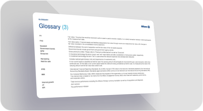 GLOSSARY Glossary (3) FV Fair value: The price that would be received to sell an asset or paid to transfer a liability in an orderly transaction between market participants at the measurement date. FVO Fair-value option: Financial assets and liabilities designated at fair value through income are measured at fair value, with changes in fair value recorded in the consolidated income statement. Goodwill Difference between the cost of acquisition and the fair value of the net assets acquired. Government bonds Government bonds include government and government agency bonds. GPW Gross premiums written: Please refer to “Premiums written/earned” as well as “Gross/net”. Gross/net In insurance terminology the terms “gross” and “net” mean before and after consideration of reinsurance ceded, respectively. In investment terminology the term “net” is used where the relevant expenses have already been deducted. Harvesting Includes realized gains/losses (net) and impairments of investments (net). Held for sale A non-current asset is classified as held for sale if its carrying amount will principally be recovered through a sale transaction rather than continued use. On the date a non-current asset meets the criteria for being considered as held for sale, it is measured at the lower of its carrying amount and its fair value less costs to sell. IFRS International Financial Reporting Standards: As of 2002, the term IFRS refers to the total set of standards adopted by the International Accounting Standards Board. Standards approved before 2002 continue to be referred to as International Accounting Standards (IAS). IMIX Our Inclusive Meritocracy Index (IMIX) measures the progress of the organization on its way towards inclusive meritocracy. This internal index is based on ten items from the Allianz Engagement Survey (AES) which deal with leadership, performance, and corporate culture. Internal growth Total revenue performance excluding the effects of foreign-currency translation as well as of acquisitions and disposals. JV Joint venture KPI Key performance indicator