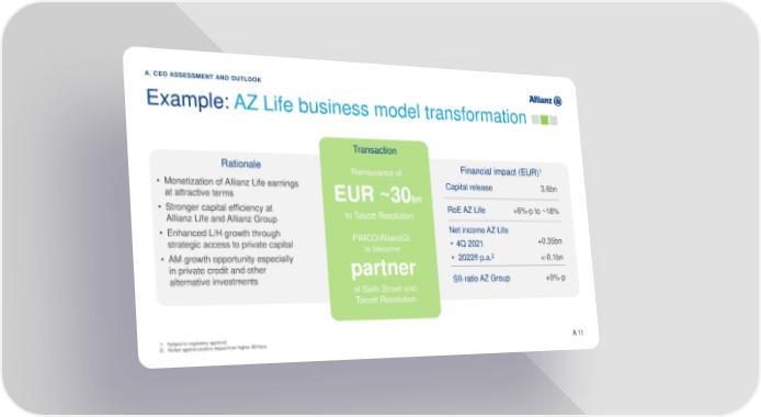 A. CEO ASSESSMENT AND OUTLOOK Example: AZ Life business model transformation Transaction Rationale Reinsurance of Financial impact (EUR)1 • Monetization of Allianz Life earnings Capital release 3.6bn at attractive terms EUR ~30bn • Stronger capital efficiency at to Talcott Resolution RoEAZ Life +6%-p to ~18% Allianz Life and Allianz Group • Enhanced L/H growth through PIMCO/AllianzGI Net income AZ Life strategic access to private capital to become • 4Q 2021 +0.35bn 2 • AM growth opportunity especially • 2022ff p.a. <-0.1bn in private credit and other partner alternative investments SII-ratio AZ Group +9%-p of Sixth Street and Talcott Resolution 1) Subject to regulatory approval 13 2) Netted against positive impact from higher AM fees A 11