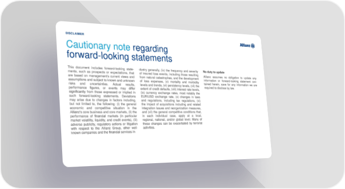 DISCLAIMER Cautionary note regarding forward-looking statements This document includes forward-looking state- dustry generally, (iv) the frequency and severity Nodutytoupdate ments, such as prospects or expectations, that of insured loss events, including those resulting Allianz assumes no obligation to update any are based on management's current views and from natural catastrophes, and the development information or forward-looking statement con- assumptions and subject to known and unknown of loss expenses, (v) mortality and morbidity tained herein, save for any information we are risks and uncertainties. Actual results, levels and trends, (vi) persistency levels, (vii) the required to disclose by law. performance figures, or events may differ extent of credit defaults, (viii) interest rate levels, significantly from those expressed or implied in (ix) currency exchange rates, most notably the such forward-looking statements. Deviations EUR/USD exchange rate, (x) changes in laws may arise due to changes in factors including, and regulations, including tax regulations, (xi) but not limited to, the following: (i) the general the impact of acquisitions including and related economic and competitive situation in the integration issues and reorganization measures, Allianz’s core business and core markets, (ii) the and (xii) the general competitive conditions that, performance of financial markets (in particular in each individual case, apply at a local, market volatility, liquidity, and credit events), (iii) regional, national, and/or global level. Many of adverse publicity, regulatory actions or litigation these changes can be exacerbated by terrorist with respect to the Allianz Group, other well- activities. knowncompanies and the financial services in-