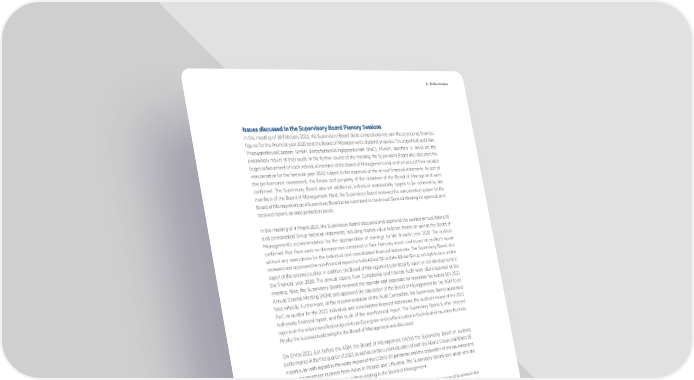 A _ To Our Investors In the meeting of 18 February 2021, the Supervisory Board dealt comprehensively with the provisional financial figures for the financial year 2020 and the Board of Management’s dividend proposal. The appointed audit firm, PricewaterhouseCoopers GmbH Wirtschaftsprüfungsgesellschaft (PwC), Munich, reported in detail on the preliminary results of their audit. In the further course of the meeting, the Supervisory Board also discussed the target achievement of each individual member of the Board of Management and, on this basis, set their variable remuneration for the financial year 2020, subject to the approval of the annual financial statements. As part of this performance assessment, the fitness and propriety of the members of the Board of Management were confirmed. The Supervisory Board also set additional, individual sustainability targets to be achieved by the members of the Board of Management. Next, the Supervisory Board reviewed the remuneration system for the Board of Management and Supervisory Board to be submitted to the Annual General Meeting for approval, and received reports on data protection issues. In the meeting of 4 March 2021, the Supervisory Board discussed and approved the audited annual Allianz SE and consolidated Group financial statements, including market value balance sheets, as well as the Board of Management’s recommendation for the appropriation of earnings for the financial year 2020. The auditors confirmed that there were no discrepancies compared to their February report and issued an auditor’s report without any reservations for the individual and consolidated financial statements. The Supervisory Board also reviewed and approved the non-financial report for both Allianz SE and the Allianz Group, taking into account the report of the external auditor. In addition, the Board of Management submitted its report on risk developments in the financial year 2020. The annual reports from Compliance and Internal Audit were also presented at the meeting. Next, the Supervisory Board reviewed the agenda and proposals for resolution for Allianz SE’s 2021 Annual General Meeting (AGM) and approved the stipulation of the Board of Management for the AGM to be held virtually. Furthermore, at the recommendation of the Audit Committee, the Supervisory Board appointed PwC as auditor for the 2021 individual and consolidated financial statements, the auditor’s review of the 2021 half-yearly financial report, and the audit of the non-financial report. The Supervisory Board further received reports on the sales intensification (push-to-pull) program and on the situation in the industrial insurance business. Finally, the succession planning for the Board of Management was discussed. On 5 May 2021, just before the AGM, the Board of Management briefed the Supervisory Board on business performance in the first quarter of 2021 as well as on the current situation of both the Allianz Group and Allianz SE, in particular with regard to the wider impact of the COVID-19 pandemic and the acquisition of the insurance and asset management business from Aviva in Poland and Lithuania. The Supervisory Board also dealt with the objectives for its composition and matters relating to the Board of Management. At the meeting on 24 June 2021, the Board of Management first reported in detail on the course of business in the financial year 2021 to date and provided an outlook on the expected results for the second quarter and the half- year results. In addition, the Board of Management reported on legal conditions for dividend distributions and the Board’s actions to protect employees in the COVID-19 pandemic, in particular Allianz’s efforts with regard to vaccinations for employees and family members. The Supervisory Board also dealt comprehensively with Allianz Direct as an insurer with uniform market presence, product range and processes, and a common platform. Other topics covered in the report were an overview of Allianz France’s business activities, a status report on cyber risks and cybersecurity at Allianz and a comparative report on key competitors. The Board of Management then reported on the implementation of its 2018 strategy and presented the first part of the strategy presentation for Strategy 2022+ (trends and implications) for discussion. The Supervisory Board also reviewed the objectives for its composition and added the topics of cybersecurity and sustainability to the skills profile. The Supervisory Board further discussed in detail the preparation for the Supervisory Board elections in 2022 and the general succession planning for the Supervisory Board. At an extraordinary meeting on 1 August 2021, the Board of Management informed the Supervisory Board in detail about new developments with respect to administrative investigations in the USA and the ongoing civil proceedings in connection with the Structured Alpha Funds of AllianzGI U.S. LLC. At a further extraordinary meeting on 29 September 2021, the Supervisory Board discussed in detail the decisions on Board of Management personnel scheduled for the next ordinary meeting and heard a report from Ms. Boshnakova on the status of the transformation at Allianz Partners. Annual Report 2021 − Allianz Group 5