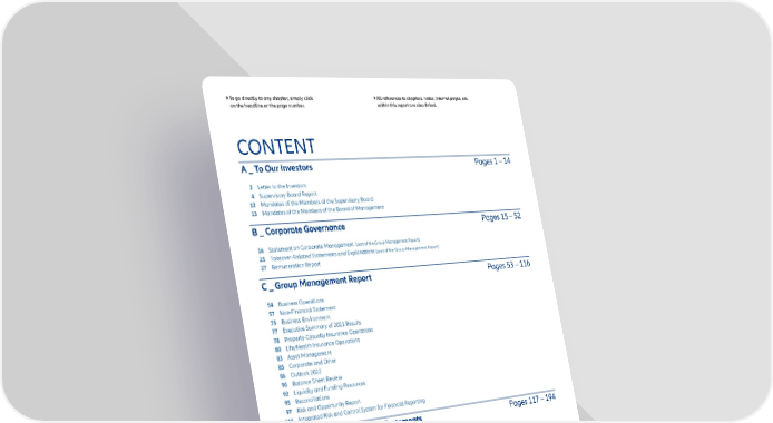 To go directly to any chapter, simply click All references to chapters, notes, internet pages, etc. on the headline or the page number. within this report are also linked. CONTENT A _ To Our Investors Pages 1 – 14 2 Letter to the Investors 4 Supervisory Board Report 12 Mandates of the Members of the Supervisory Board 13 Mandates of the Members of the Board of Management B _ Corporate Governance Pages 15 – 52 16 Statement on Corporate Management (part of the Group Management Report) 25 Takeover-Related Statements and Explanations (part of the Group Management Report) 27 Remuneration Report C _ Group Management Report Pages 53 – 116 54 Business Operations 57 Non-Financial Statement 75 Business Environment 77 Executive Summary of 2021 Results 78 Property-Casualty Insurance Operations 80 Life/Health Insurance Operations 83 Asset Management 85 Corporate and Other 86 Outlook 2022 90 Balance Sheet Review 92 Liquidity and Funding Resources 95 Reconciliations 97 Risk and Opportunity Report 116 Integrated Risk and Control System for Financial Reporting D _ Consolidated Financial Statements Pages 117 – 194 118 Consolidated Balance Sheet 119 Consolidated Income Statement 120 Consolidated Statement of Comprehensive Income 121 Consolidated Statement of Changes in Equity 122 Consolidated Statement of Cash Flows NOTES TO THE CONSOLIDATED FINANCIAL STATEMENTS 125 General Information 145 Notes to the Consolidated Balance Sheet 161 Notes to the Consolidated Income Statement 166 Other Information E _ Further Information Pages 195 – 204 196 Responsibility Statement 197 Independent Auditor’s Report 204 Auditor’s Report