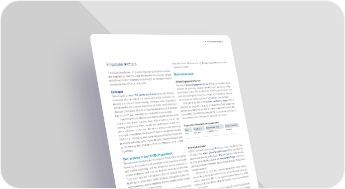 C _ Group Management Report Employee matters local regulations. We have also significantly reduced business travel compared to 2019. This section describes our employees’ impact on our business activities and relationships, and vice versa. We describe the concepts, actions Business as usual and achievements in managing these impacts. All employee matters are managed by the Group HR function. Allianz Engagement Survey The annual Allianz Engagement Survey (AES) is our formal employee platform for gathering employee feedback and promoting a high- Delivering our purpose “We secure your future” starts with 155,4111 performance culture. The results of the AES are directly linked to the employees who are part of our diverse and global workforce. Our performance targets for the Group’s Board of Management. This year purpose anchors our Group strategy, employee value proposition, we achieved our second-best result in the Allianz Group´s history. brand promise and customer experience principles, and it drives our One part of the AES is the Inclusive Meritocracy Index (IMIX). It decisions and actions. We held our second global Purpose & Strategy measures our progress in building a culture where both people and Day in autumn 2021 to engage our employees on our purpose. performance matter, as we seek to enable employees to unlock their A diverse workforce enables us to understand and fulfill the needs full potential. The IMIX score comprises 10 AES questions covering the of our equally diverse customer base. Allianz fosters a culture and areas of leadership, performance and corporate culture. working environment where people and performance matter, and where everyone has a voice. We take a strong stance regarding Targets and achievements: employee matters employee engagement, diversity and inclusion, and gender equality. Topic Targets 2021 Achievements 2021 Targets 2022-2024 We focus on managing talent, rewarding personal achievements and IMIX 73 % plus 78 % (2020: 78 %) 75 % plus promoting employee rights. The health, safety, and well-being as well as the training and development of our employees is of utmost importance. Diversity & Inclusion Our response to the COVID-19 pandemic In 2021, we rolled out two new policies that underpin the Allianz Code We continue to closely monitor the impact of COVID-19 on our global of Conduct: the Allianz Diversity and Inclusion Policy describes our workforce. The pandemic cast a spotlight on the importance of health rationale for diversity and inclusion (D&I) and how we foster diversity and mental well-being, and we introduced various measures to in all its forms, and the Allianz Anti-Harassment Policy outlines our support employees and meet our business needs during the crisis. global zero tolerance standard against sexual and other harassment These have included help/advisory lines for physical and mental and discrimination. health issues, preventative health measures, and special support for More than 20 CEOs and board members from Allianz entities working parents, such as additional leave to enable parents to take around the globe are part of the Global Inclusion Council, which has care of unexpected childcare needs. been in place since 2007. It oversees the implementation of our D&I Convinced that vaccination will help the return to more normality strategy built around three pillars: Employees, Customers, and Brand soon, Allianz has conducted vaccination campaigns in 2021. In and Reputation. addition, Allianz booster shot campaigns have started. We take a strong stance to increase the diversity of our leadership and management, and set new targets and ambitions for December New ways of working 2024 that extend beyond gender representation and cover the In 2021, we have introduced more flexible, collaborative and agile dimensions of generations, nationality and ethnicity, LGBTQ+ and ways of working that empower our employees, customers and disability. For more information, please see section 02.4.1 of our Group organization. These new Ways of Working (WOW) aim to enhance Sustainability Report 2021 and our D&I website employee engagement, productivity and innovation, resulting in https://www.allianz.com/en/about-us/strategy- simpler and prompter service offerings for our customers, resilience to values/diversity.html protect us from future crises, and a faster and flatter organization and culture. COVID-19 required us to respond rapidly to unexpected We promote employee networks to raise awareness, support situations and new priorities. The challenges increased the pace of employees, advocate for change and help shape the D&I agenda. At change with respect to how we work together and engage with each the global level, three new global networks were established in 2021 other and our stakeholders. bringing the total to five, each focused on a key priority for D&I: The focus areas for our WOW standards are centered across five categories: 1. Flexible work & Reduced travel, 2. Digital tools, 3. Health − Allianz NEO – gender inclusion, & Well-being, 4. Learning, 5. Organization & Culture. For instance, − Allianz Pride – LGBTQ+ inclusion, employees across the globe have the opportunity to spend a minimum − Allianz Engage – generations inclusion, of 40 percent of their working hours working from home (depending − Allianz GRACE – ethnicity and cultural inclusion, on the position, e.g., mobile worker, office worker, etc.) and the − Allianz Beyond – disability inclusion. opportunity to work up to 25 days a year abroad in accordance with 1_Total employees (core and non-core business). Annual Report 2021 − Allianz Group 69