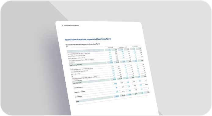 D _ Consolidated Financial Statements Reconciliation of reportable segments to Allianz Group figures € mn Total revenues Operating profit (loss) Net income (loss) 2021 2020 2021 2020 2021 2020 German Speaking Countries and Central & Eastern Europe 16,507 16,108 1,844 1,858 1,496 1,258 Western & Southern Europe and Asia Pacific 12,196 12,081 1,478 1,646 1,129 1,108 Iberia & Latin America and Allianz Partners 12,256 11,051 521 680 232 357 Global Insurance Lines & Anglo Markets, Middle East and Africa 26,471 27,047 1,867 188 1,261 (118) Consolidation (5,158) (6,875) - (1) (5) - Total Property-Casualty 62,272 59,412 5,710 4,371 4,113 2,605 German Speaking Countries and Central & Eastern Europe 31,078 33,113 1,794 1,725 1,222 1,186 Western & Southern Europe and Asia Pacific 31,924 29,498 1,734 1,561 1,234 1,205 Iberia & Latin America 1,446 1,419 166 159 122 606 USA 13,214 9,915 1,357 907 1,428 820 Global Insurance Lines & Anglo Markets, Middle East and Africa 1,179 1,034 70 49 249 (21) Consolidation and Other (493) (936) (111) (41) (86) (30) Total Life/Health 78,348 74,044 5,011 4,359 4,170 3,766 Asset Management 8,396 7,347 3,489 2,853 (191) 1,973 Corporate and Other 289 245 (772) (831) (964) (1,216) Consolidation (794) (593) (38) (1) (23) 5 Group 148,511 140,455 13,400 10,751 7,105 7,133 144 Annual Report 2021 − Allianz Group