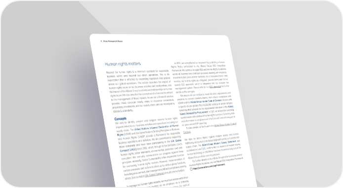 C _ Group Management Report Human rights matters In 2021, we strengthened our approach by publishing a Human Rights Policy embedded in the Allianz Group ESG Integration Respect for human rights is a minimum standard for responsible Framework. We continue to apply ESG and Human Rights Guidelines business within and beyond our direct operations. This is an across all business lines and core processes dealing with insurance, expectation that is reflected by expanding legislation and applied investment and procurement decisions. As a corporate insurer and across our global operations. This section describes the impact of investor, our human rights due diligence process forms part of our human rights issues on our business activities and relationships, and overall ESG approach, which is integrated into our broader risk the impact of the Allianz Group´s activities and relationships on human management system. Please refer to our ESG approach for further rights issues. We also describe the concepts and achievements related details on the concepts. to the management of those impacts. As we are a financial services We require all our vendors to meet fair labor requirements and provider, these concepts mainly relate to insurance transactions, practices to prevent modern slavery and ensure compliance with proprietary investments, and our supply chain, and are managed by UDHR and the Allianz Group Vendor Code of Conduct. Vendors with Global Sustainability. a spend volume greater than € 250,000 undergo a vendor integrity screening that is based on the requirements laid down in the Allianz Global Standard for Procurement. In 2021, we revised the screening We aim to identify, prevent and mitigate adverse human rights questionnaire with additional human rights questions. Screening data impacts linked to our business activities and operations including our and information in compliance with the Code of Conduct forms part of supply chain. The United Nations Universal Declaration of Human our procurement KPI reporting. Rights (UDHR) and the United Nations Guiding Principles on Business Further details can be found in the Allianz Group Vendor Code of and Human Rights (UNGP) provide a framework for responsible Conduct. business operations and activities. We are committed to respecting these standards and have been participating in the U.N. Global We take an active stance against modern slavery and human Compact (UNGC) since 2002, which, through its ten principles, covers trafficking, and pursue a risk-based approach across our business and human rights, labor standards, environmental protection and anti- supply chain. The Allianz Group Modern Slavery Statement, last corruption. We annually communicate our progress against these published in June 2021, confirms that no incident of modern slavery, principles. Internally, Global Sustainability is the responsible function human trafficking, or child labor has been found involving any of the for overseeing human rights matters. However, implementation of Allianz Group entities over the past year. certain processes and actions is taken up by various group functions, For further details on the Allianz Group’s referral process and our including procurement, risk management, HR and compliance, among Human Rights Guideline, see the Allianz ESG Integration Framework others. See our latest U.N. Global Compact annual communication . https://www.allianz.com/esg-framework. To manage our human rights impacts, we must look across each of our roles as an insurer and investor, as an employer, as a company, including our supply chain, and as a corporate citizen. For each of these roles, we have embedded different processes to manage human rights risks and act on opportunities to drive positive change. Targets and achievements: human rights matters Topic Targets 2021 Achievements 2021 Targets 2022 Modern Slavery Act Continue to report on human − No issues were raised in regard to human Continue to report on human rights issues as rights issues as defined in the rights issues in accordance with the defined in the (UK) Modern Slavery Act. Modern Slavery Act. Modern Slavery Act in 2021. − Allianz Group Modern Slavery Statement was updated in mid-2021. 68 Annual Report 2021 − Allianz Group