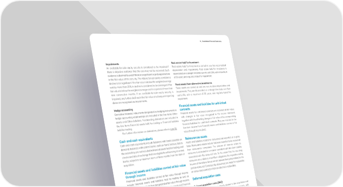 D _ Consolidated Financial Statements Impairments Real estate held for investment An available-for-sale equity security is considered to be impaired if Real estate held for investment is carried at cost less accumulated there is objective evidence that the cost may not be recovered. Such depreciation and impairments. Real estate held for investment is evidence is deemed to exist if there is a significant or prolonged decline depreciated on a straight-line basis over its useful life, with a maximum in the fair value of the security. The Allianz Group’s policy considers a of 50 years, and regularly tested for impairment. decline to be significant if the fair value is below the weighted average cost by more than 20 %. A decline is considered to be prolonged if the Fixed assets from alternative investments fair value is below the weighted average cost for a period of more than These assets are carried at cost less accumulated depreciation and nine consecutive months. If an available-for-sale equity security is impairments. They are depreciated on a straight-line basis over their impaired, any further declines in the fair value at subsequent reporting useful life, with a maximum of 35 years, and regularly tested for dates are recognized as impairments. impairment. Hedge accounting Financial assets and liabilities for unit-linked Derivative financial instruments designated as hedging instruments in contracts hedge accounting relationships are included in the line items Other Financial assets for unit-linked contracts are recorded at fair value, assets and Other liabilities. Freestanding derivatives are included in with changes in fair value recognized in the income statement the line items Financial assets held for trading or Financial liabilities together with the offsetting changes in fair value of the corresponding held for trading. financial liabilities for unit-linked contracts. They are included in the For further information on derivatives, please refer to note 3 line item Income from financial assets and liabilities carried at fair 3. value through income (net). Cash and cash equivalents Cash and cash equivalents include balances with banks payable on Reinsurances assets demand, balances with central banks, cash on hand, treasury bills to Assets and liabilities related to reinsurance are reported on a gross the extent they are not included in financial assets held for trading, and basis. Reinsurance assets include balances expected to be recovered checks and bills of exchange that are eligible for refinancing at central from reinsurance companies. The amount of reserves ceded to banks, subject to a maximum term of three months from the date of reinsurers is estimated in a manner consistent with the claim liability acquisition. associated with the reinsured risks. To the extent that the assuming reinsurers are unable to meet their obligations, the respective ceding Financial assets and liabilities carried at fair value insurers of the Allianz Group remain liable to their policyholders for the through income portion reinsured. Consequently, allowances are made for receivables Financial assets and liabilities carried at fair value through income on reinsurance contracts which are deemed uncollectible. include financial assets and liabilities held for trading as well as financial assets and liabilities designated at fair value through income. Deferred acquisition costs While the former category includes trading instruments and financial derivatives, the latter category is mainly designated at fair value to Deferred acquisition costs (DAC) avoid accounting mismatches. Costs that vary with and are directly related to the acquisition and renewal of insurance contracts and investment contracts with Investments discretionary participation features are deferred by recognizing a DAC asset. At inception, DAC is tested to ensure that it is recoverable over Available-for-sale investments the life of the contracts. Subsequently, loss recognition tests at the end Available-for-sale investments comprise debt and equity instruments of each reporting period ensure that the DAC is covered by future that are designated as available-for-sale or do not fall into the other profits. measurement categories. Realized gains and losses on those For short-duration, traditional long-duration, and limited- instruments are generally determined by applying the average cost payment insurance contracts, DAC is amortized in proportion to method at the subsidiary or the portfolio level. premium revenue recognized. For universal life-type and participating life insurance contracts as well as investment contracts with Funds held by others under reinsurance contracts assumed discretionary participation features, DAC is generally amortized over Funds held by others under reinsurance contracts assumed relate to the life of a book of contracts based on estimated gross profits (EGP) cash deposits to which the Allianz Group is entitled, but which the or estimated gross margins (EGM), respectively. ceding insurer retains as collateral for future obligations of the Acquisition costs for unit-linked investment contracts are deferred Allianz Group. The cash deposits are recorded at the amount due on in accordance with IFRS 15, if the costs are incremental. For non-unit- repayment, less any impairment for balances that are deemed not to linked investment contracts accounted for under IAS 39 at amortized be recoverable. cost, acquisition costs that meet the definition of transaction costs under IAS 39 are considered in the aggregate policy reserves. Investments in associates and joint ventures For details on the accounting for investments in associates and joint Present value of future profits (PVFP) ventures, please see the section principles of consolidation. The value of an insurance business or an insurance portfolio acquired is measured by the PVFP, which is the present value of net cash flows Annual Report 2021 − Allianz Group
