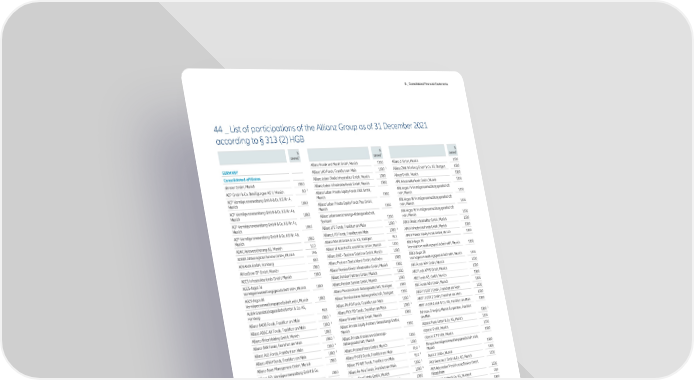 D _ Consolidated Financial Statements 44 _ List of participations of the Allianz Group as of 31 December 2021 according to § 313 (2) HGB % % % 1 1 1 owned owned owned Allianz Kunde und Markt GmbH, Munich 100.0 Allianz X GmbH, Munich 100.0 GERMANY Allianz LAD Fonds, Frankfurt am Main 100.0 3 Allianz ZWK Nürnberg GmbH & Co. KG, Stuttgart 100.0 Consolidated affiliates Allianz Leben Direkt Infrastruktur GmbH, Munich 100.0 Allvest GmbH, Munich 100.0 abracar GmbH, Munich 100.0 Allianz Leben Infrastrukturfonds GmbH, Munich 100.0 APK Infrastrukturfonds GmbH, Munich 100.0 ACP GmbH & Co. Beteiligungen KG II, Munich 0.0 2 Allianz Leben Private Equity Fonds 2001 GmbH, APK-Argos 75 Vermögensverwaltungsgesellschaft ACP Vermögensverwaltung GmbH & Co. KG Nr. 4, Munich 100.0 mbH, Munich 100.0 Munich 100.0 Allianz Leben Private Equity Fonds Plus GmbH, APK-Argos 85 Vermögensverwaltungsgesellschaft ACP Vermögensverwaltung GmbH & Co. KG Nr. 4a, Munich 100.0 mbH, Munich 100.0 Munich 100.0 Allianz Lebensversicherungs-Aktiengesellschaft, APK-Argos 95 Vermögensverwaltungsgesellschaft ACP Vermögensverwaltung GmbH & Co. KG Nr. 4c, Stuttgart 100.0 mbH, Munich 100.0 Munich 100.0 Allianz LFE Fonds, Frankfurt am Main 100.0 3 APKV Direkt Infrastruktur GmbH, Munich 100.0 ACP Vermögensverwaltung GmbH & Co. KG Nr. 4d, Allianz L-PD Fonds, Frankfurt am Main 100.0 3 APKV Infrastrukturfonds GmbH, Munich 100.0 Munich 100.0 ADAC Autoversicherung AG, Munich 51.0 Allianz NM 28 GmbH & Co. KG, Stuttgart 93.3 APKV Private Equity Fonds GmbH, Munich 100.0 ADEUS Aktienregister-Service-GmbH, Munich 79.6 Allianz of Asia-Pacific and Africa GmbH, Munich 100.0 APKV-Argos 74 Allianz ONE - Business Solutions GmbH, Munich 100.0 Vermögensverwaltungsgesellschaft mbH, Munich 100.0 ADVANIA GmbH, Hamburg 60.0 APKV-Argos 84 AfricaGrow GP GmbH, Munich 100.0 Allianz Partners Deutschland GmbH, Aschheim 100.0 Vermögensverwaltungsgesellschaft mbH, Munich 100.0 AGCS Infrastrukturfonds GmbH, Munich 100.0 Allianz Pension Direkt Infrastruktur GmbH, Munich 100.0 ARE Funds APK GmbH, Munich 100.0 AGCS-Argos 76 Allianz Pension Partners GmbH, Munich 100.0 ARE Funds APKV GmbH, Munich 100.0 Vermögensverwaltungsgesellschaft mbH, Munich 100.0 Allianz Pension Service GmbH, Munich 100.0 ARE Funds AZL GmbH, Munich 100.0 AGCS-Argos 86 Allianz Pensionsfonds Aktiengesellschaft, Stuttgart 100.0 ARE Funds AZV GmbH, Munich 100.0 Vermögensverwaltungsgesellschaft mbH, Munich 100.0 Allianz Pensionskasse Aktiengesellschaft, Stuttgart 100.0 ALIDA Grundstücksgesellschaft mbH & Co. KG, AREF III GER 1 GmbH, Frankfurt am Main 100.0 Hamburg 94.8 Allianz PK-PD Fonds, Frankfurt am Main 100.0 3 AREF III GER 2 GmbH, Frankfurt am Main 100.0 Allianz AADB Fonds, Frankfurt am Main 100.0 3 Allianz PKV-PD Fonds, Frankfurt am Main 100.0 3 AREF III GER GmbH & Co. KG, Frankfurt am Main 100.0 Allianz ADAC AV Fonds, Frankfurt am Main 100.0 3 Allianz Private Equity GmbH, Munich 100.0 Ashmore Emerging Market Corporates, Frankfurt Allianz Africa Holding GmbH, Munich 100.0 Allianz Private Equity Partners Verwaltungs GmbH, am Main 100.0 3 Munich 100.0 atpacvc Fund GmbH & Co. KG, Munich 100.0 Allianz AKR Fonds, Frankfurt am Main 100.0 3 Allianz Private Krankenversicherungs- atpacvc GmbH, Munich 100.0 Allianz ALD Fonds, Frankfurt am Main 100.0 3 Aktiengesellschaft, Munich 100.0 Allianz APAV Fonds, Frankfurt am Main 100.0 3 Allianz ProzessFinanz GmbH, Munich 100.0 atpacvc GP GmbH, Munich 100.0 Allianz Asset Management GmbH, Munich 100.0 Allianz PV-RD Fonds, Frankfurt am Main 92.4 3 Atropos Vermögensverwaltungsgesellschaft mbH, Munich 100.0 Allianz AZL Vermögensverwaltung GmbH & Co. Allianz PV-WS Fonds, Frankfurt am Main 92.4 3 KG, Munich 100.0 Auros II GmbH, Munich 100.0 Allianz Re Asia Fonds, Frankfurt am Main 100.0 3 Allianz Beratungs- und Vertriebs-AG, Munich 100.0 AV8 Ventures II GmbH & Co. KG, Munich 100.0 Allianz Real Estate GmbH, Munich 100.0 4 Allianz Capital Partners GmbH, Munich 100.0 AVS Automotive VersicherungsService GmbH, Allianz Rechtsschutz-Service GmbH, Munich 100.0 Rüsselsheim 100.0 Allianz Capital Partners Verwaltungs GmbH, Allianz Renewable Energy Management GmbH, AZ ATLAS GmbH & Co. KG, Stuttgart 94.9 Munich 100.0 Sehestedt 100.0 Allianz Climate Solutions GmbH, Munich 100.0 AZ ATLAS Immo GmbH, Stuttgart 100.0 Allianz Renewable Energy Subholding GmbH & Co. AZ ATLAS Verwaltungs-GmbH, Stuttgart 100.0 Allianz Deutschland AG, Munich 100.0 KG, Sehestedt 100.0 Allianz Digital Health GmbH, Munich 100.0 4 Allianz RFG Fonds, Frankfurt am Main 100.0 3 AZ Northside GmbH & Co. KG, Stuttgart 94.0 Allianz Direct Versicherungs-AG, Munich 100.0 Allianz Risk Consulting GmbH, Munich 100.0 AZ-Arges Vermögensverwaltungsgesellschaft mbH, Munich 100.0 Allianz DLVR Fonds, Frankfurt am Main 100.0 3 Allianz SDR Fonds, Frankfurt am Main 100.0 3 AZ-Argos 41 Vermögensverwaltungsgesellschaft Allianz EEE Fonds, Frankfurt am Main 100.0 3 Allianz SE Ashmore Emerging Markets Corporates mbH, Munich 100.0 Allianz EP GmbH, Munich 100.0 Fund, Frankfurt am Main 100.0 3 AZ-Argos 56 Vermögensverwaltungsgesellschaft Allianz Esa EuroShip GmbH, Bad Friedrichshall 51.0 Allianz SE-PD Fonds, Frankfurt am Main 100.0 3 mbH, Munich 100.0 Allianz Esa GmbH, Bad Friedrichshall 100.0 Allianz Service Center GmbH, Munich 100.0 AZ-Argos 71 Vermögensverwaltungsgesellschaft Allianz SOA Fonds, Frankfurt am Main 100.0 3 mbH & Co. KG, Munich 100.0 Allianz FAD Fonds, Frankfurt am Main 100.0 3 Allianz Stromversorgungs-GmbH, Munich 100.0 AZ-Argos 88 Vermögensverwaltungsgesellschaft Allianz Finanzbeteiligungs GmbH, Munich 100.0 mbH, Munich 100.0 Allianz Focus Teleport Beteiligungs-GmbH & Co. Allianz Taunusanlage GbR, Stuttgart 99.5 AZL AI Nr. 1 GmbH, Munich 100.0 KG, Stuttgart 100.0 Allianz Technology SE, Munich 100.0 AZL Four T1 GmbH, Frankfurt am Main 100.0 Allianz Global Corporate & Specialty SE, Munich 100.0 Allianz Treuhand GmbH, Stuttgart 100.0 AZL PE Nr. 1 GmbH, Munich 100.0 Allianz Global Health GmbH, Munich 100.0 Allianz 