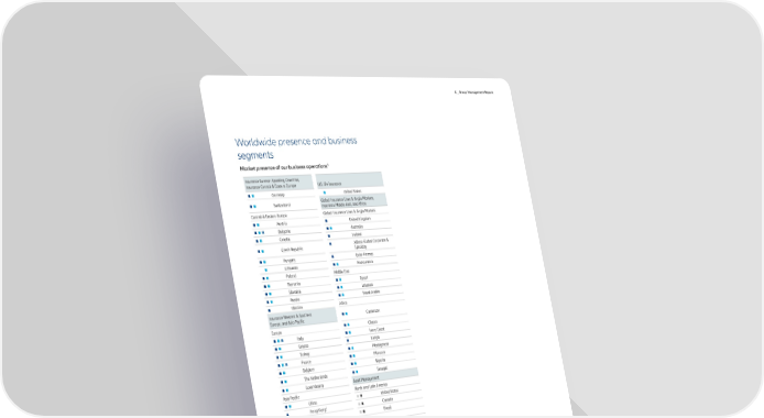 C _ Group Management Report Worldwide presence and business segments Market presence of our business operations1 Insurance German Speaking Countries, Insurance Central & Eastern Europe U.S. life insurance Germany United States Switzerland Global Insurance Lines & Anglo Markets, Insurance Middle East, and Africa Central & Eastern Europe Global Insurance Lines & Anglo Markets Austria United Kingdom Bulgaria Australia Croatia Ireland Allianz Global Corporate & Czech Republic Specialty Hungary Euler Hermes Lithuania Reinsurance Poland Middle East Romania Egypt Slovakia Lebanon Russia Saudi Arabia Ukraine Africa Insurance Western & Southern Europe, and Asia Pacific Cameroon Europe Ghana Italy Ivory Coast Greece Kenya Turkey Madagascar France Morocco Belgium Nigeria The Netherlands Senegal Luxembourg Asset Management Asia Pacific North and Latin America China United States 2 Hong Kong Canada Indonesia Brazil 2 Japan Europe Laos Germany Malaysia France Pakistan Italy Philippines Ireland Singapore Luxembourg Sri Lanka Spain Taiwan Switzerland Thailand Belgium India The Netherlands Insurance Iberia & Latin America, Allianz Partners, and Allianz Direct United Kingdom Iberia Sweden Spain Asia Pacific Portugal Japan Latin America Hong Kong Argentina Taiwan Brazil Singapore Colombia China Mexico Australia Allianz Partners Allianz Partners Allianz Direct Allianz Direct Property-Casualty Life/Health Banking Retail Asset Management Institutional Asset Management 1_This overview is based on our organizational structure as of 31 December 2021. 2_Property-Casualty business belongs to Allianz Global Corporate & Specialty. Annual Report 2021 − Allianz Group 55