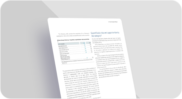C _ Group Management Report The following table presents the sensitivities of our Solvency II Quantifiable risks and opportunities by capitalization ratio under certain standard financial market scenarios. 1 risk category Allianz Group: Solvency II regulatory capitalization ratio sensitivities This Risk and Opportunity Report outlines the Group’s risk figures, % reflecting its risk profile based on pre-diversified risk figures and Group As of 31 December 2021 2020 diversification effects. Base capitalization ratio 209 207 At the Allianz Group, we measure and steer risk based on an Interest rates up by 0.5 %1 213 214 approved internal model which quantifies the potential adverse Interest rates down by 0.5 %1 204 198 developments of Own Funds. The results provide an overview of how Equity prices up by 30 % 222 222 our risk profile is distributed over different risk categories, and Equity prices down by 30 % 194 193 determine the regulatory capital requirements in accordance with Combined scenario: Solvency II. Equity prices down by 30 % Interest rate down by 0.5 %1 With the exception of the Asset Management business segment, Credit spreads up by 0.5 % 171 161 all business segments are exposed to the full range of risk categories. 1_Non-parallel interest rate shifts due to extrapolation of the yield curve beyond the last liquid point in line with As mentioned earlier, the Asset Management business segment is Solvency II rules. predominantly exposed to operational risks. In addition, there is some exposure to market risks and to a lesser extent to credit risks. The risk capital for the Asset Management business segment is allocated to The presented sensitivity analyses are based on defined variations of sectoral requirement. specific parameters and describe the resulting development of our The pre-diversified risk figures reflect the diversification effect Solvency II capitalization under such idealized scenarios (e.g., within each modeled risk category (i.e., market, credit, underwriting, decrease in interest rates by 50 basis points). The observed business, and operational risk), but do not include the diversification developments will, however, typically materialize in a more complex effects across risk categories. Group diversified risk figures also capture way (e.g., interest rates are typically not decreasing in a parallel shift the diversification effect across all risk categories. manner along the term structure). Therefore, sensitivities are to be interpreted in a way such that they provide valuable information on areas to which our capitalization is particularly sensitive together with an indication of the estimated magnitude. The actual observed developments in the capitalization can, however, be more or less pronounced depending on the specific realized circumstances. Our comprehensive stress testing framework is regularly analyzed in order to identify potential enhancements to support the explanatory power of stress tests conducted in light of our risk profile. The Allianz Group is a financial conglomerate within the scope of the Financial Conglomerate Directive (FCD). The FCD does not impose a materially different capital requirement on Allianz Group compared to Solvency II. 1_This section contains specific risk disclosures as required by IFRS 4 and IFRS 7 relating to the Notes to the Consolidated Financial Statements. Annual Report 2021 − Allianz Group 111