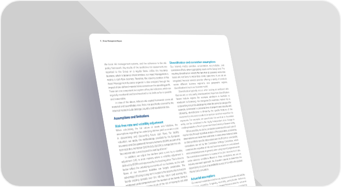 C _ Group Management Report the local risk management systems, and the adherence to the risk Diversification and correlation assumptions policy framework. Key results of the qualitative risk assessments are Our internal model considers concentration, accumulation, and reported to the Group on a regular basis. Unlike the insurance correlation effects when aggregating results at the Group level. The business, which is balance sheet sensitive, our Asset Management is resulting diversification reflects the fact that all potential worst-case mainly a cash flow business. Therefore, the solvency position of the losses are not likely to materialize at the same time. As we are an Asset Management business segment is also analyzed through the integrated financial services provider offering a variety of products impact of pre-defined material stress scenarios on the operating profit. across different business segments and geographic regions, These are one component in a system of key risk indicators, which are diversification is key to our business model. regularly monitored and benchmarked to risk limits as far as possible Diversification typically occurs when looking at combined risks and reasonable. that are not, or only partly, interdependent. Important diversification In view of the above, Allianz’s risk capital framework covers all factors include regions (for example, windstorm in Australia vs. material and quantifiable risks. Risks not specifically covered by the windstorm in Germany), risk categories (for example, market risk vs. internal model include strategic, liquidity, and reputational risks. underwriting risk), and subcategories within the same risk category (for example, commercial vs. personal lines of property and casualty risk). Ultimately, diversification is driven by the specific features of the investment or insurance products in question and their respective risk Risk-free rate and volatility adjustment exposures. For example, an operational risk event at an Australian When calculating the fair values of assets and liabilities, the entity can be considered to be highly independent of a change in assumptions regarding the underlying risk-free yield curve are crucial credit spreads for a French government bond held by a German entity. in determining and discounting future cash flows. For liability Where possible, we derive correlation parameters for each pair of valuation, we apply the methodology provided by the European market risks through statistical analysis of historical data, considering Insurance and Occupational Pensions Authority (EIOPA) as part of its observations over more than a decade. In cases where historical data technical documentation (EIOPA-BoS-20/109) to extrapolate the risk- or other portfolio-specific observations are insufficient or unavailable, free interest rate curves beyond the last liquid tenor.1 correlations are set by the Correlation Settings Committee, which In addition, we adjust the risk-free yield curves by a volatility combines the expertise of risk and business experts in a well-defined adjustment (VA) in most markets where a volatility adjustment is and controlled process. In general, when using expert judgment we set defined by EIOPA and approved by the local regulator. This is done to the correlation parameters to represent the joint movement of risks better reflect the underlying economics of our business, as the cash under adverse conditions. Based on these correlations, we use an flows of our insurance liabilities are largely predictable. The industry-standard approach, the Gaussian copula, to determine the advantage of being a long-term investor is the opportunity to invest in dependency structure of quantifiable sources of risk within the applied bonds yielding spreads over the risk-free return and earning this Monte Carlo simulation. additional yield component over the duration of the bonds. Being a long-term investor mitigates much of the risk of having to sell debt Actuarial assumptions instruments at a loss prior to maturity. Our internal model also includes assumptions on claims trends, liability We take account of this by applying the volatility adjustment to inflation, mortality, longevity, morbidity, policyholder behavior, mitigate the credit spread risk, which we consider to be less meaningful expenses, etc. We use our own internal historical data for actuarial for long-term investors than the default risk. Allianz also models the assumptions wherever possible, additionally considering volatility adjustment dynamically within our approved internal model, recommendations from the insurance industry, supervisory authorities, which differs from the static EIOPA VA concept applied in the standard and actuarial associations. The derivation of our actuarial formula. For risk capital calculations, we assume a dynamic movement assumptions is based on generally accepted actuarial methods. of the volatility adjustment broadly consistent with the way the VA Within our internal risk capital and financial reporting framework, would react in practice; however, we base the movement on our own comprehensive processes and controls exist for ensuring the reliability portfolio rather than the EIOPA portfolio. To account for this deviation, of these assumptions. Allianz applies a more conservative, reduced application ratio for the dynamic volatility adjustment. Validation is performed regularly to verify the appropriateness and prudency of the approach. As the internal model is based on a 99.5 % confidence level, there is a low statistical probability of 0.5 % that actual losses could exceed this Valuation assumptions: replicating portfolios threshold at the Group level in the course of one year. We replicate the liabilities of our Life/Health insurance business. This We use model and scenario parameters derived from historical technique enables us to represent all product-related options and data, where available, to characterize future pos
